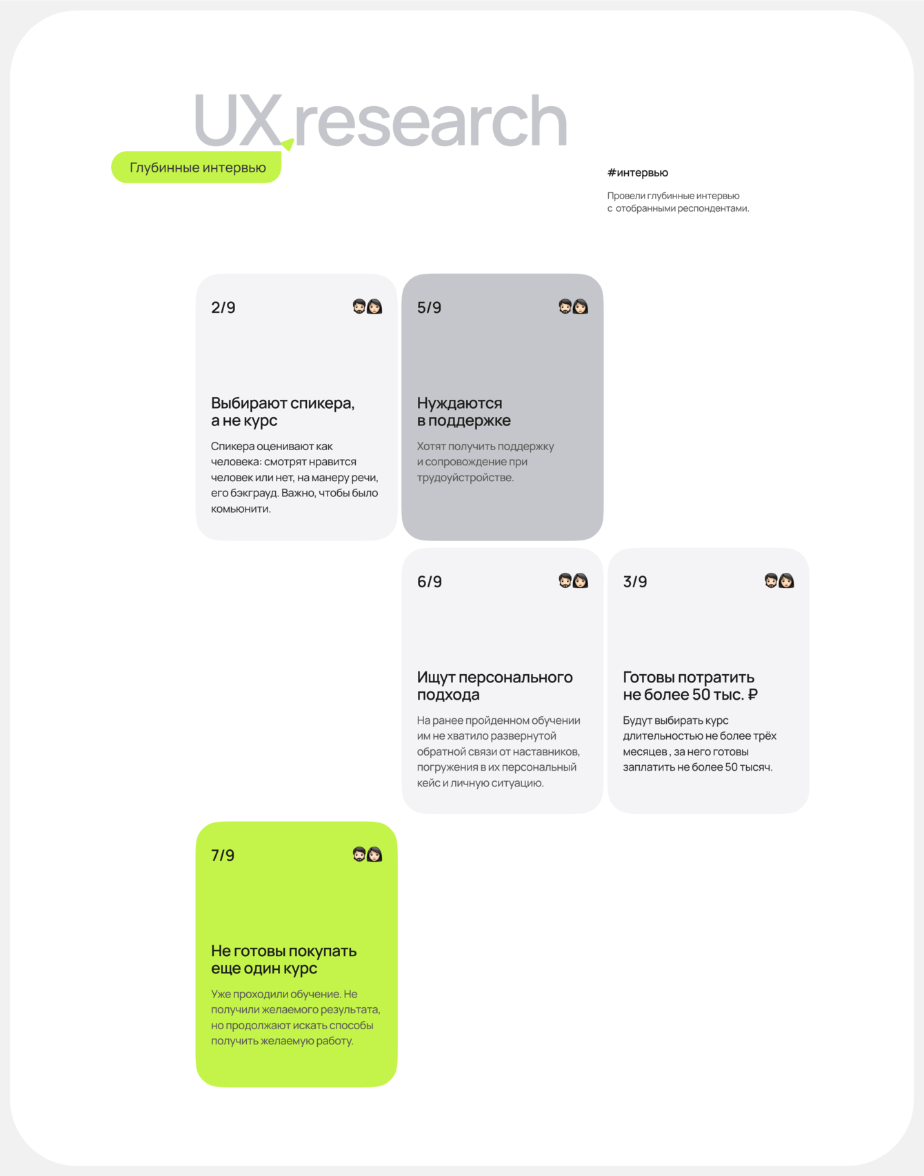Посетившие сайт — люди, которые уже приобретали курсы в других школах. Их основная проблема — они не понимают, что делать дальше. Устроиться на работу с “корочкой” не получается, HR-ы требуют релевантный опыт работы. 82% опрошенных не прошли первый этап собеседования.