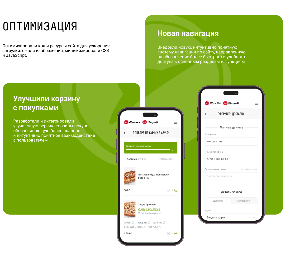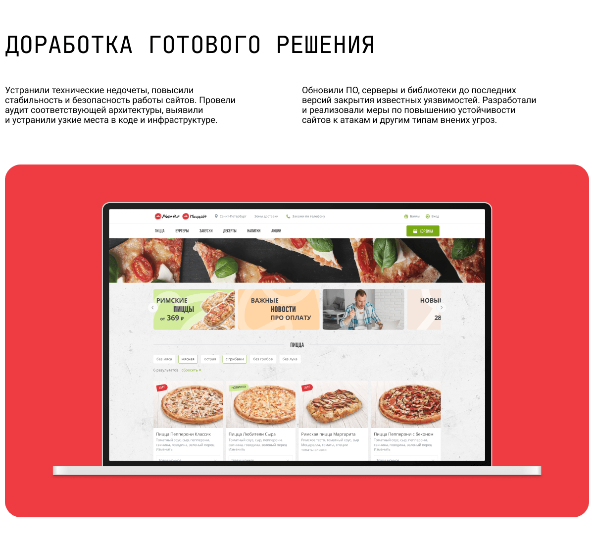 В январе 2023 года к нам обратилось российское подразделение Pizza Hut с задачей обеспечения технической поддержки и развития их веб-ресурсов. Работа велась над двумя основными сайтами: https://pizzahut.ru и https://pizzan.ru. Эти платформы играют ключевую роль в обеспечении доступности и удобства сервисов компании для широкой аудитории.