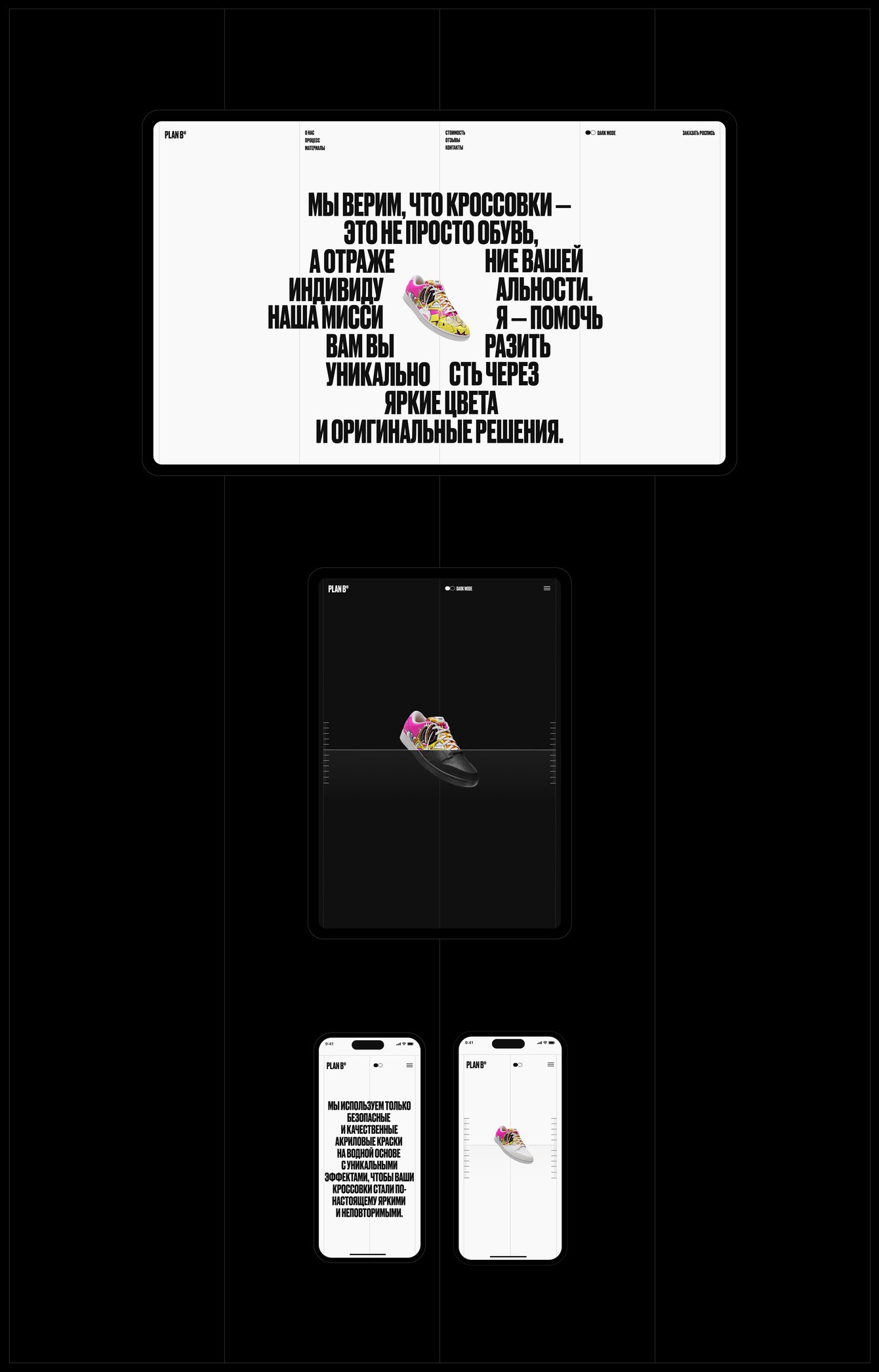 Идея сайта — раскрыть процесс кастомизации на всех её стадиях. За счёт детализированных 3D‑моделей и плавных анимаций сайт буквально оживает: пользователи могут не просто увидеть результат, а погрузиться в процесс создания уникальной пары кроссовок.