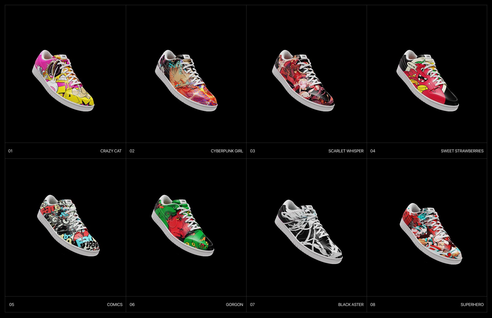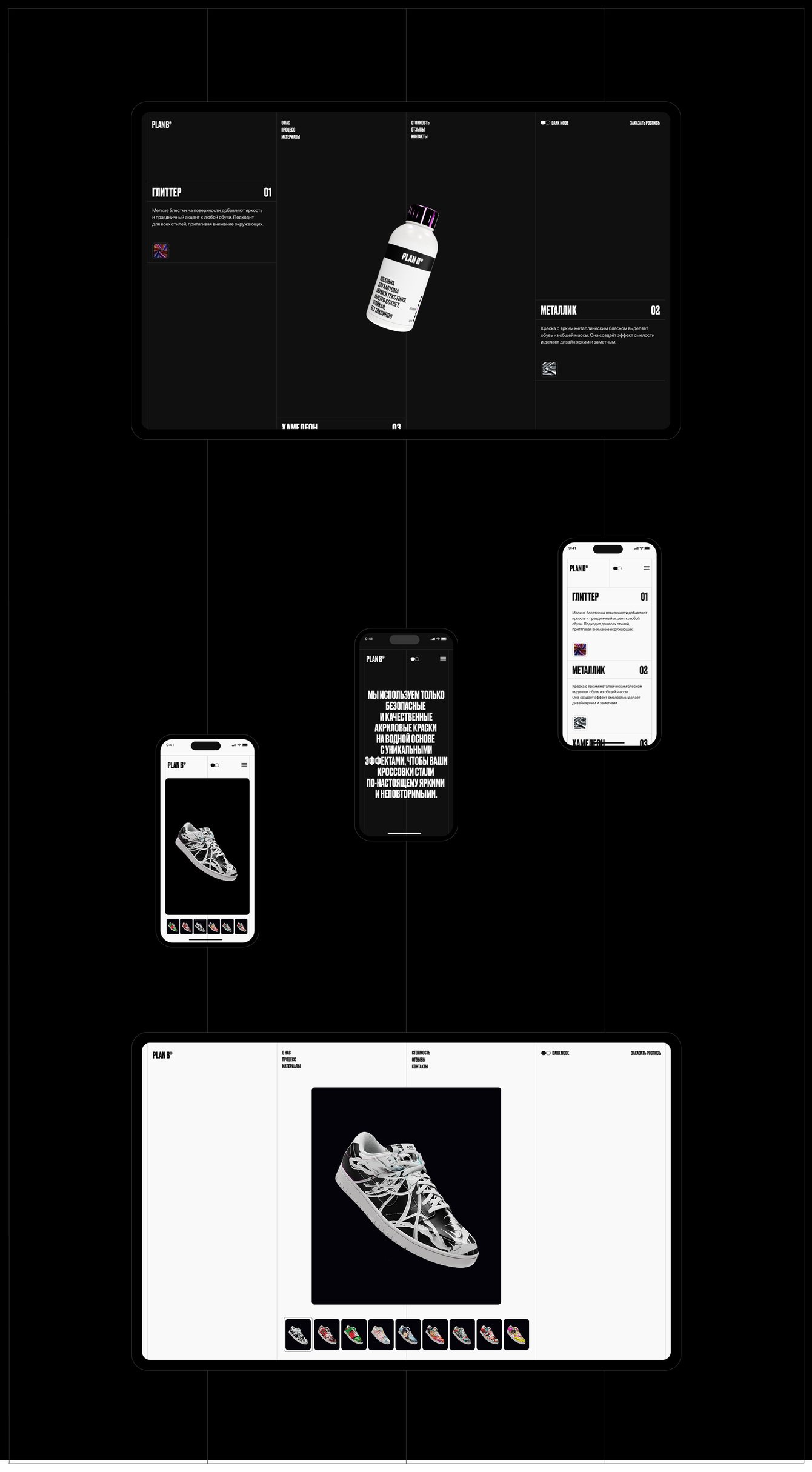 Идея сайта — раскрыть процесс кастомизации на всех её стадиях. За счёт детализированных 3D‑моделей и плавных анимаций сайт буквально оживает: пользователи могут не просто увидеть результат, а погрузиться в процесс создания уникальной пары кроссовок.