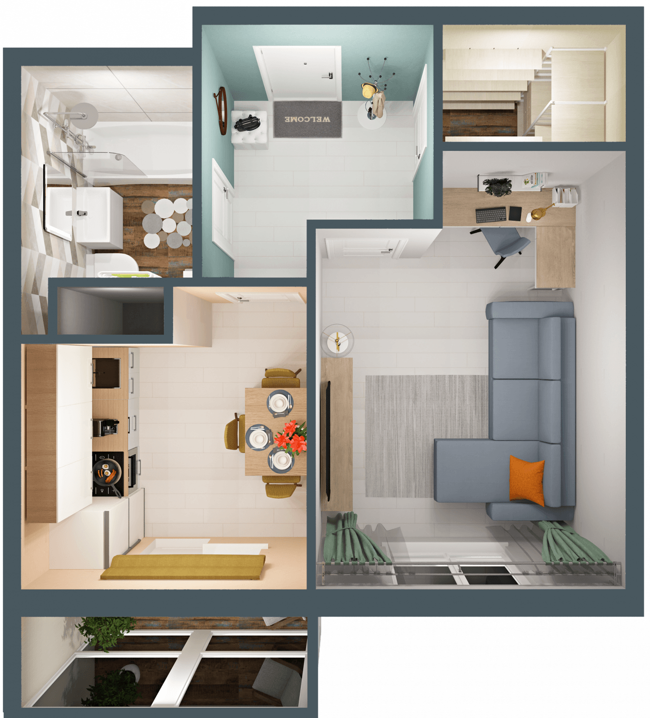 Сделать правильную планировку с растановкой мебели. Далее сделать 3D.