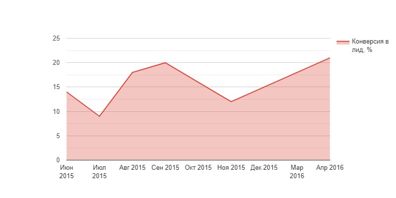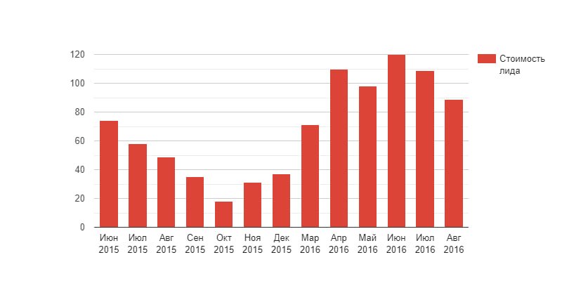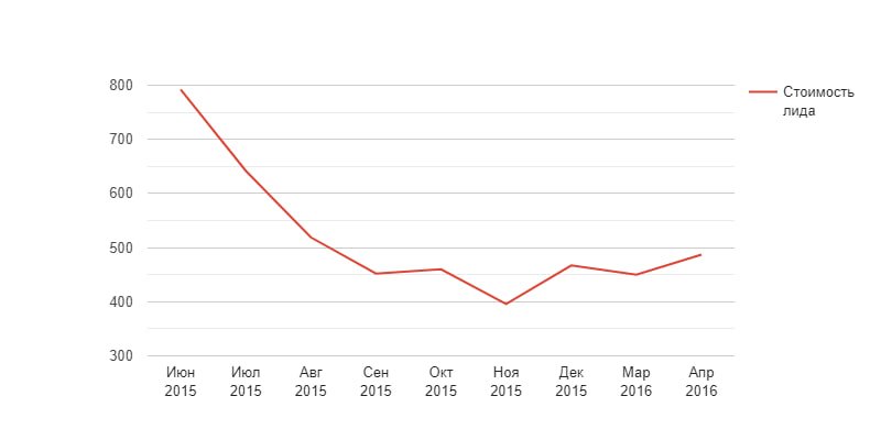 Работа с конверсией велась постоянно, добавлялись акции, контролировалось ценовое предложение, также контролировались расходы на краулинговый бюджет. В результате статистика по стоимости привлечения лидов получилась вот такой