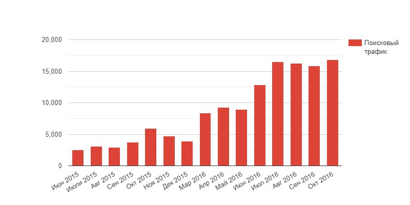 Посещаемость сайта по целевым коммерческим запросам выросла за 12 месяцев работы на 669%, преодолев барьер в 16000 переходов в месяц.