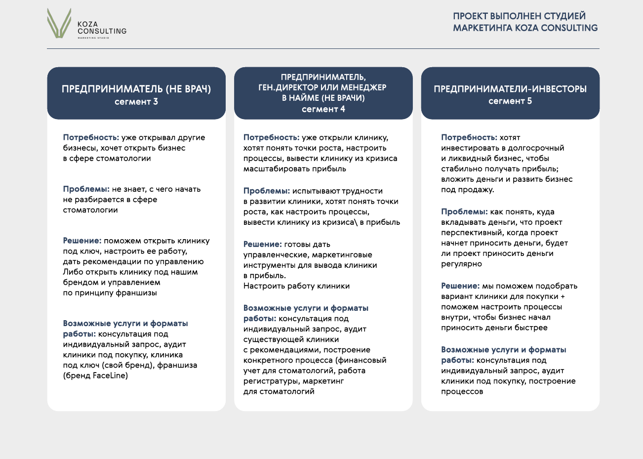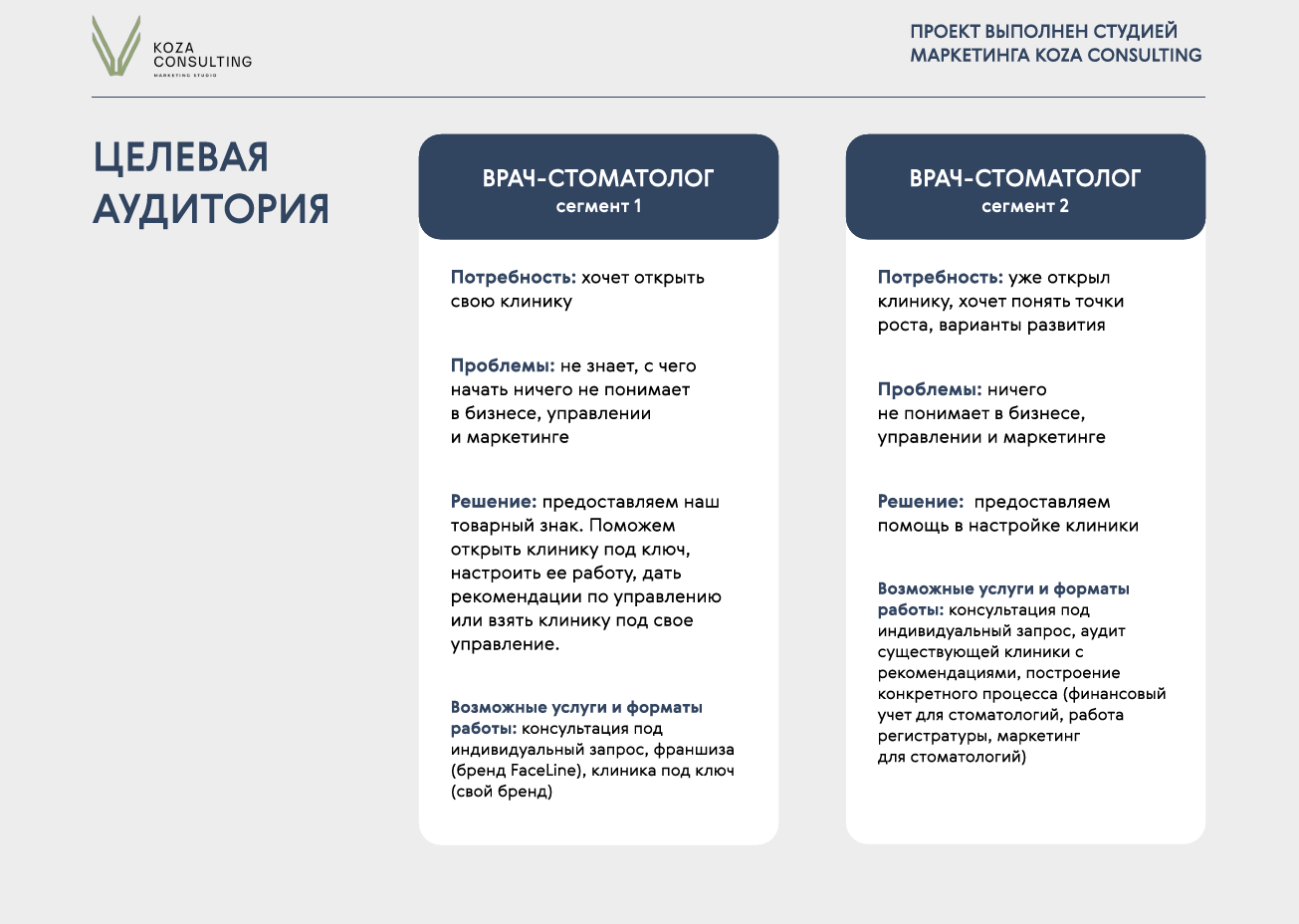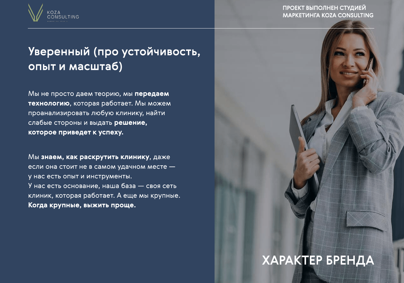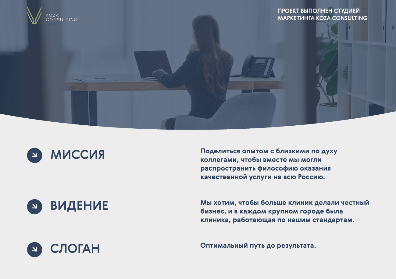 Исходя из задач клиента разработали позиционирование бренда на рынке, описали все составляющие платформы бренда и продуктовую линейку клиники.