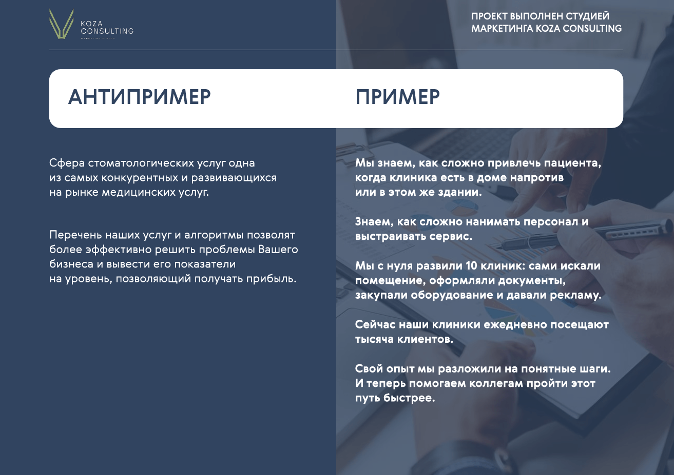 Есть сеть клиник FaceLine. Основатели имеют огромный опыт в работе стоматологических клиник и знают, как вывести их в прибыль. Приняли решение создать новый проект – консалтинг в стоматологическом бизнесе, основываясь на собственном опыте и экпертизе.