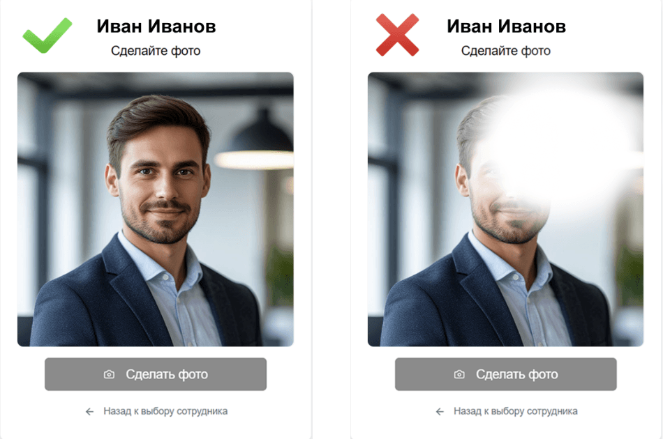 ✔ Биометрическая верификация – собственная нейросеть анализирует лицо сотрудника в реальном времени (не обмануть фото или маской).