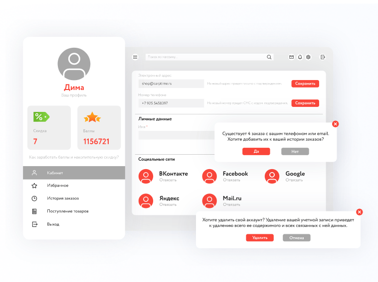 Настроена программа лояльности, накопительные, прогрессирующие скидки, купоны.