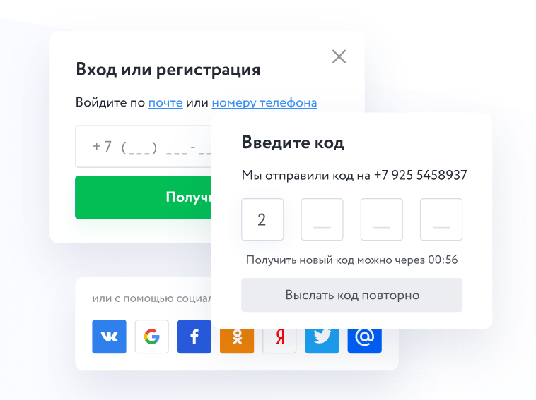 Настроена авторизация пользователя с помощью SMS и социальных сетей.