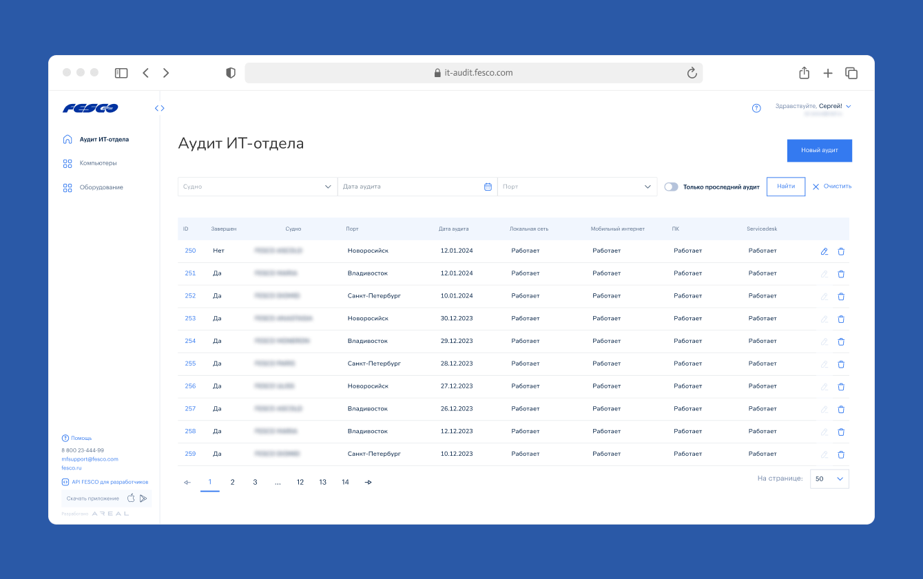 Кроме предварительного создания аудита, специалист изучает информацию о прошлой проверке. В веб-приложении собран реестр аудитов с фильтрацией по судну, порту и дате. У каждого отчета есть детальная страница.