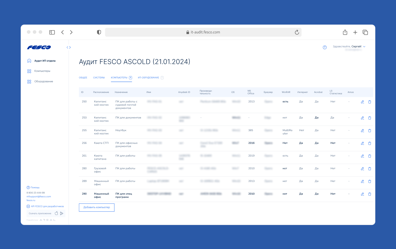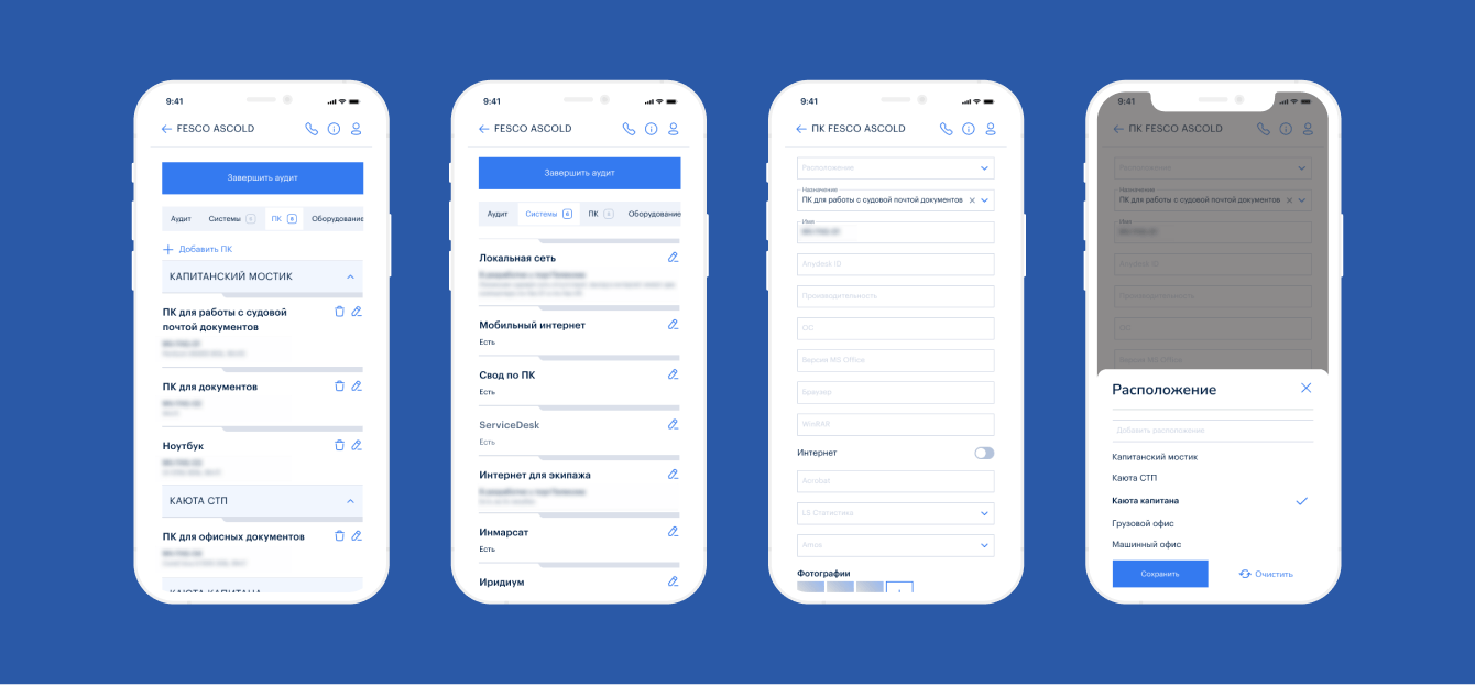— Перечень компьютеров с указанием комплектующих, установленных программ. Загружает фотографии аудита. Для удобства ПК разбиты по расположению на судне.