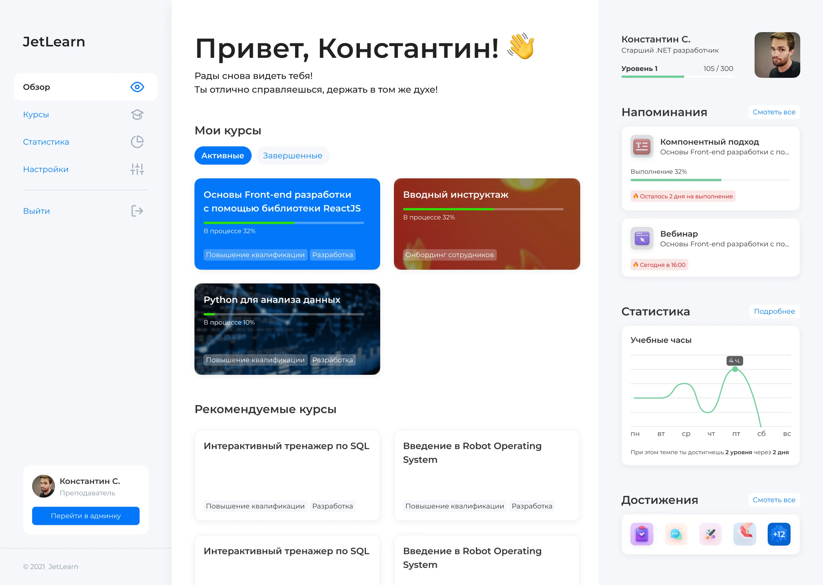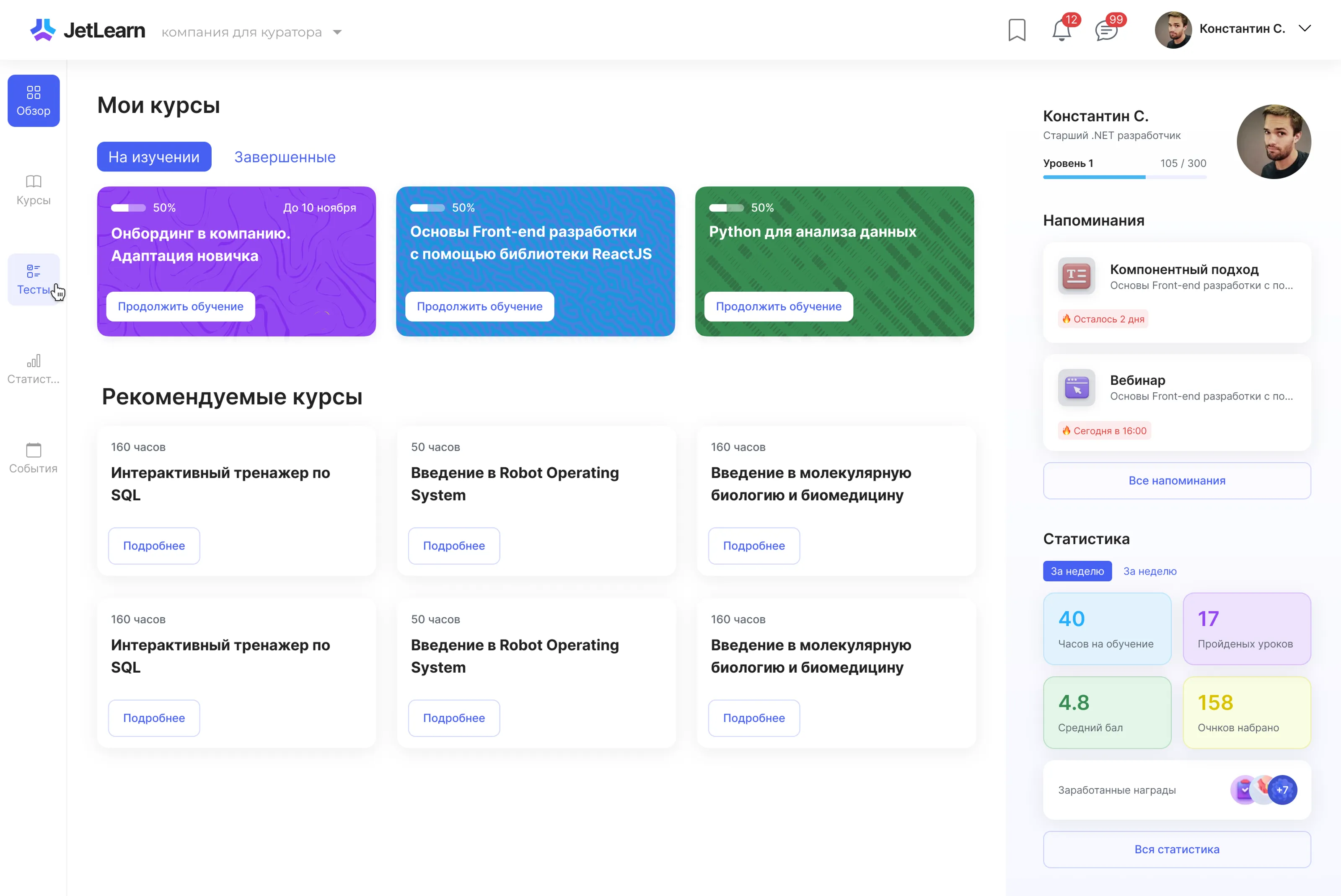 На примере пяти образовательных платформ показали заказчику возможные варианты интерфейсных паттернов для типовых элементов интерфейса (профиль, страница курса и т.п.).