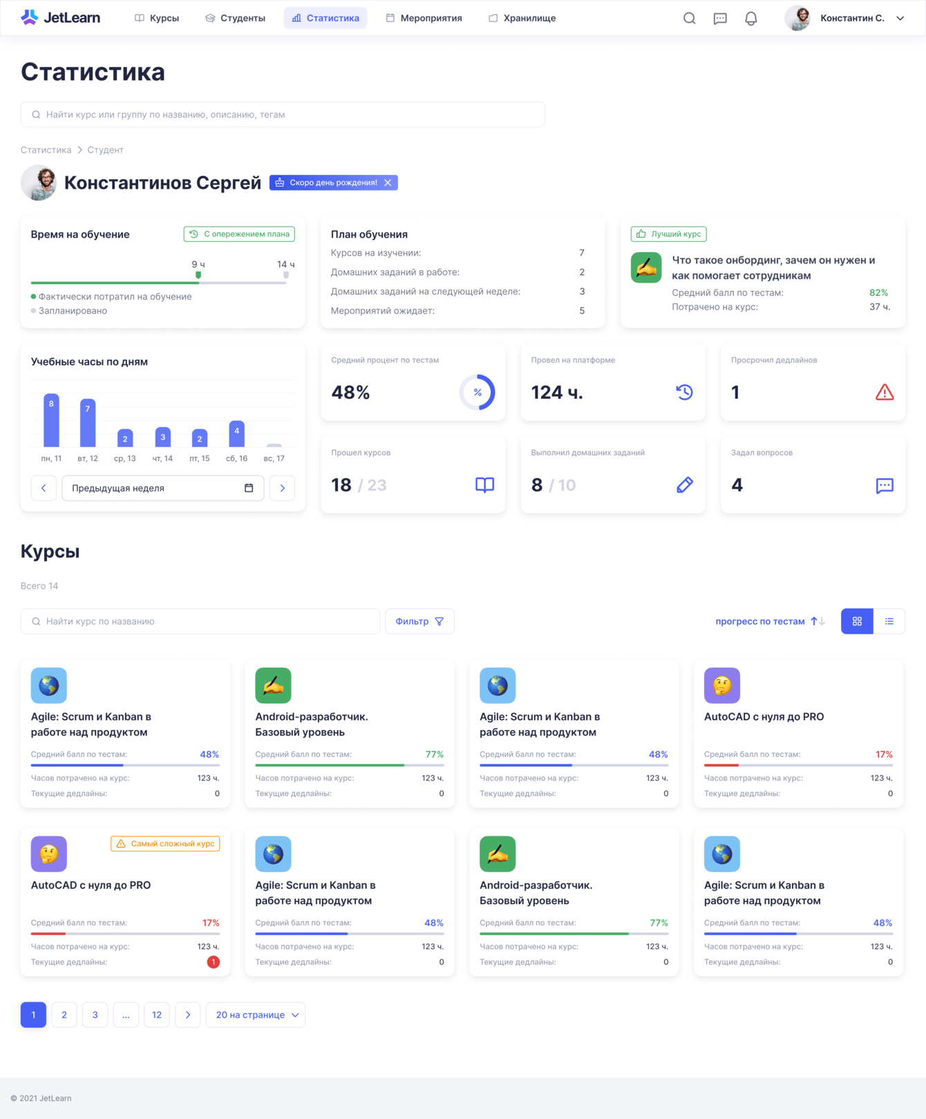 Заказчик выбрал светлый, красочный, непринужденный стиль. В основном текстовый, оформительскими тенями и скругленными уголками. Для студентов — воздушный, с цветными заливками. Для адниминистраторов — скорее плотный, с точечными акцентами.