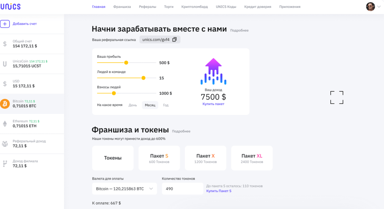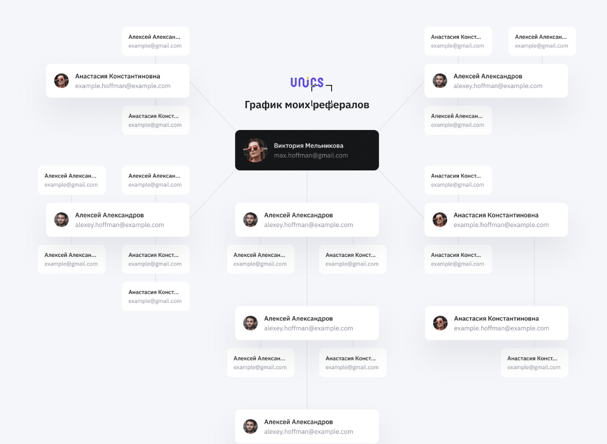 Также у UNICS есть реферальная система, которая позволяет создать собственную партнерскую сеть и получать пассивный доход. Структура сети, данные об участниках и прочая информация по этой системе находится в разделе «Рефералы».