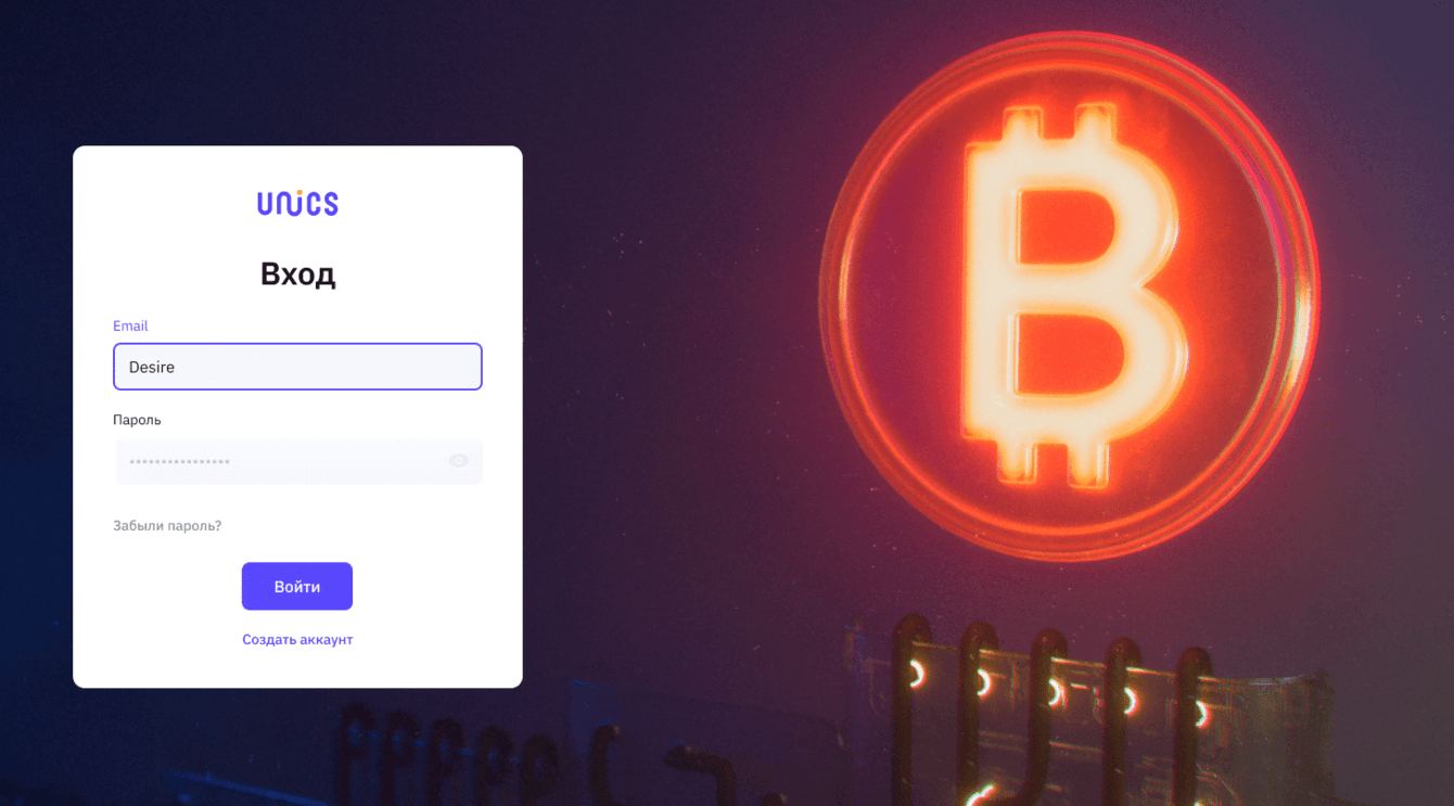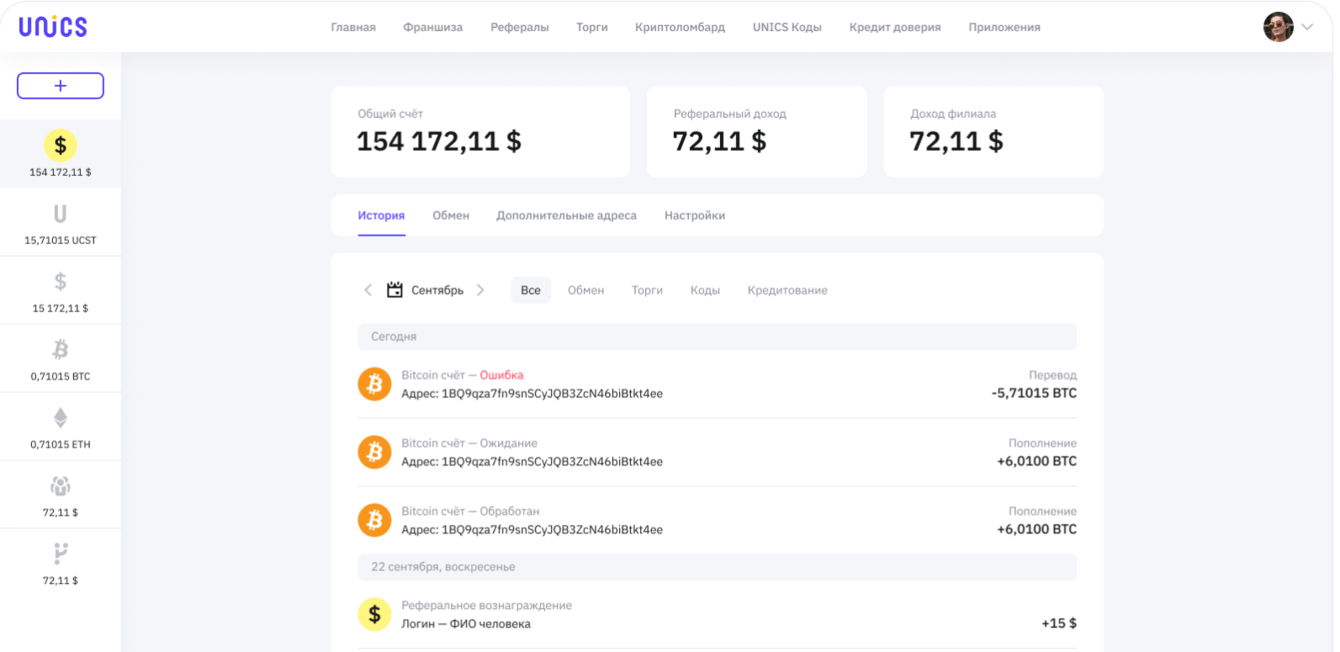 В UNICS есть возможность мгновенно создать кошельки с наиболее распространенными криптовалютами, а также с 4 стандартными валютами для обмена между ними.