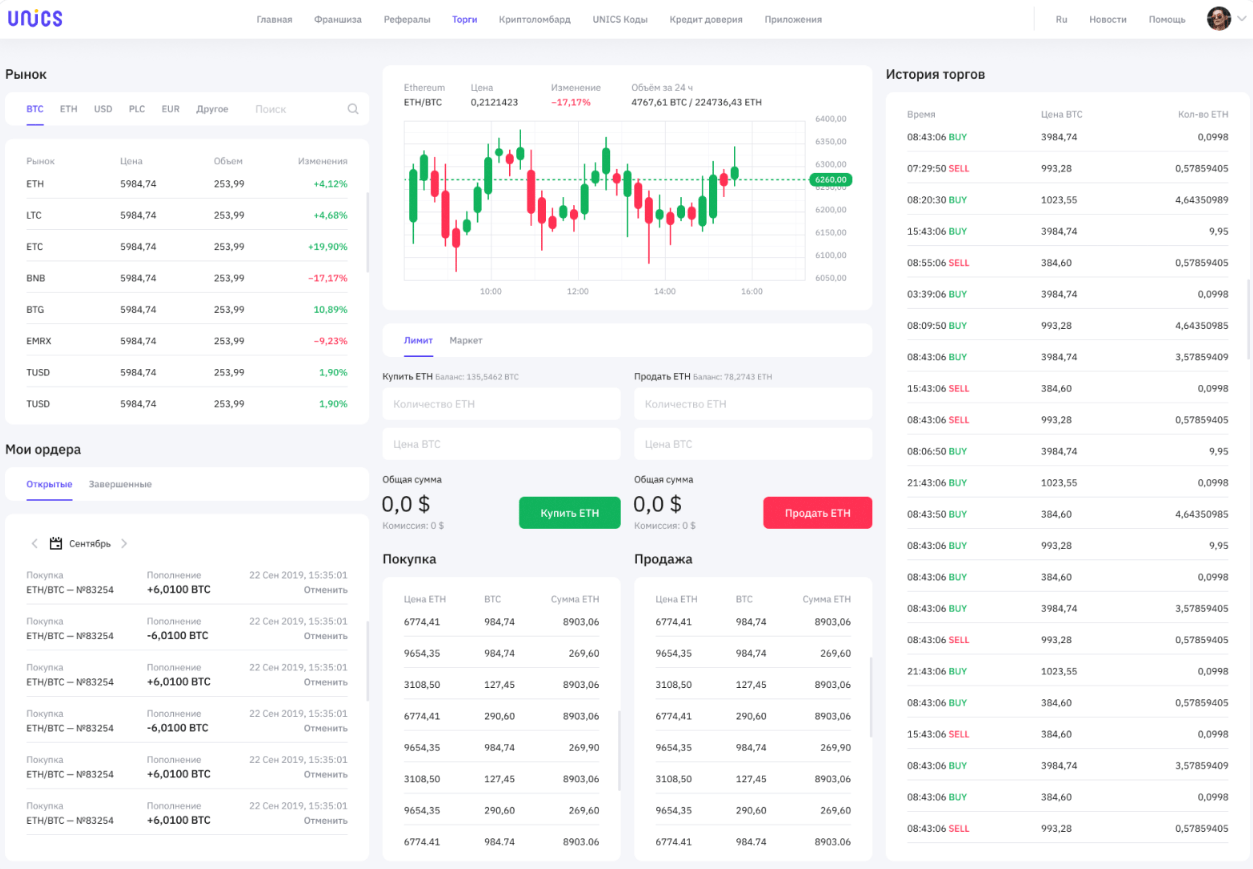 Данный раздел представляет из себя полноценную криптовалютную биржу, на которой можно отслеживать курс, покупать и продавать интересующую криптовалюту