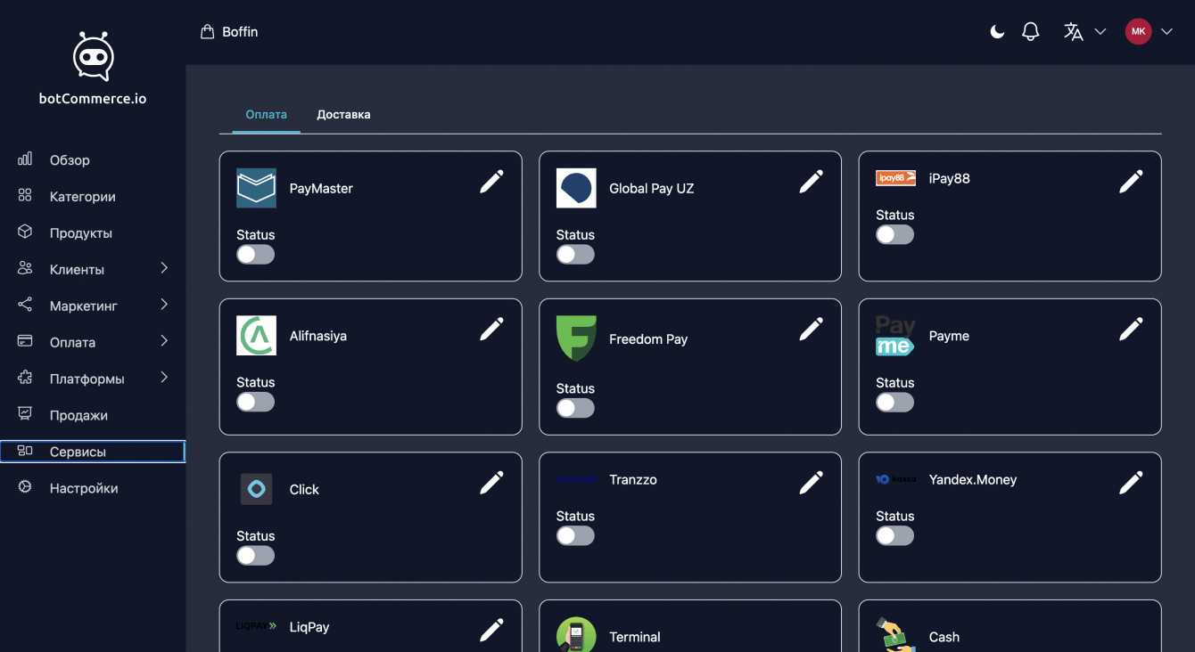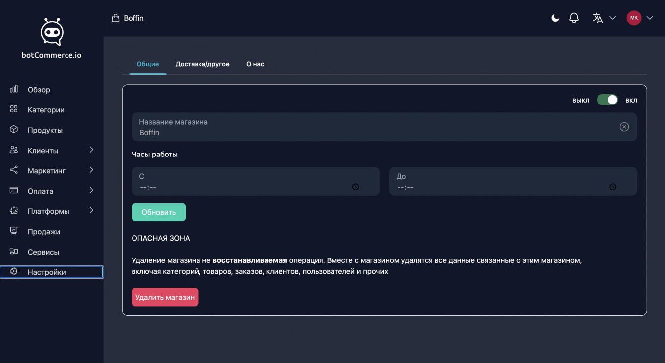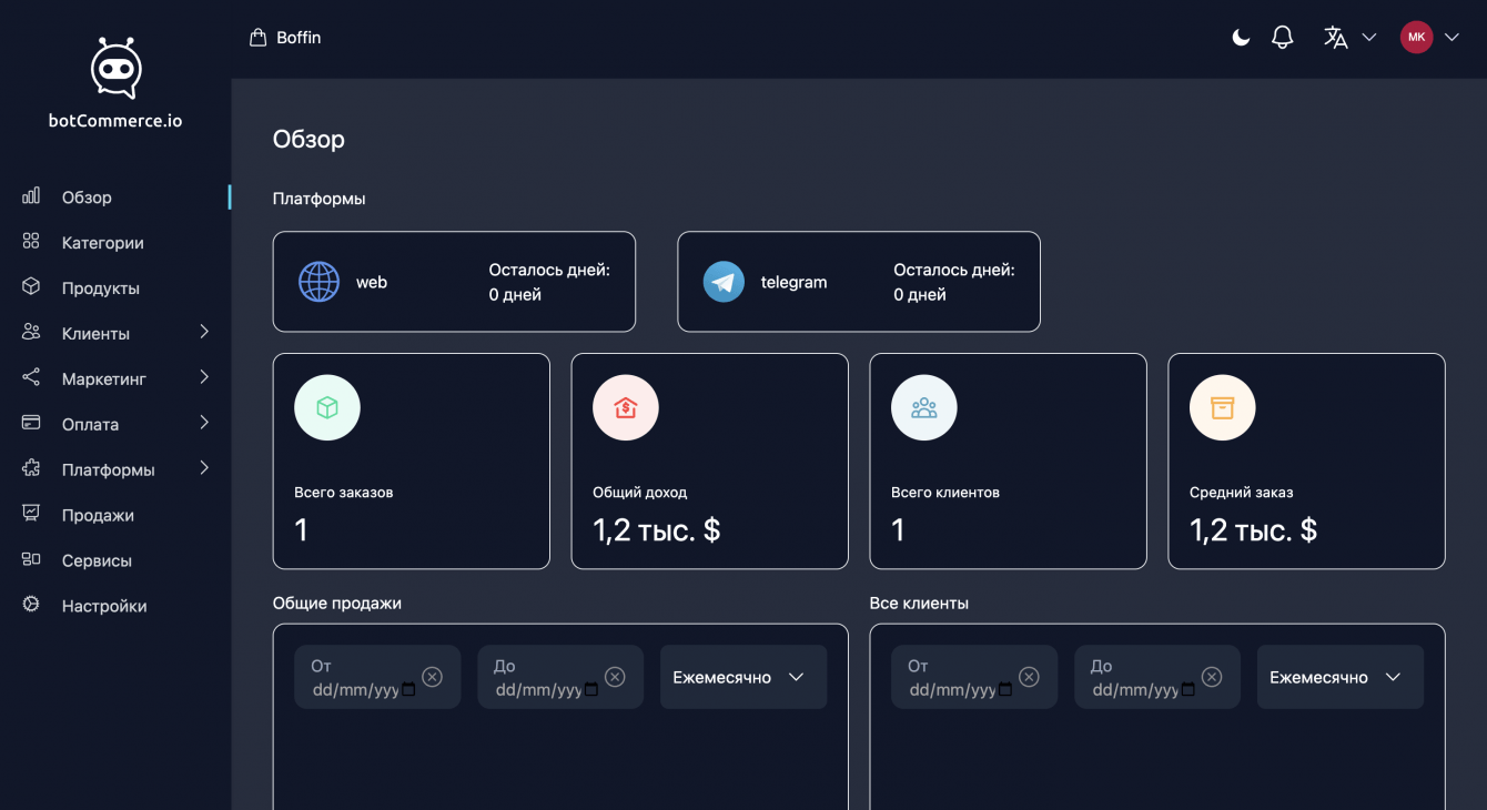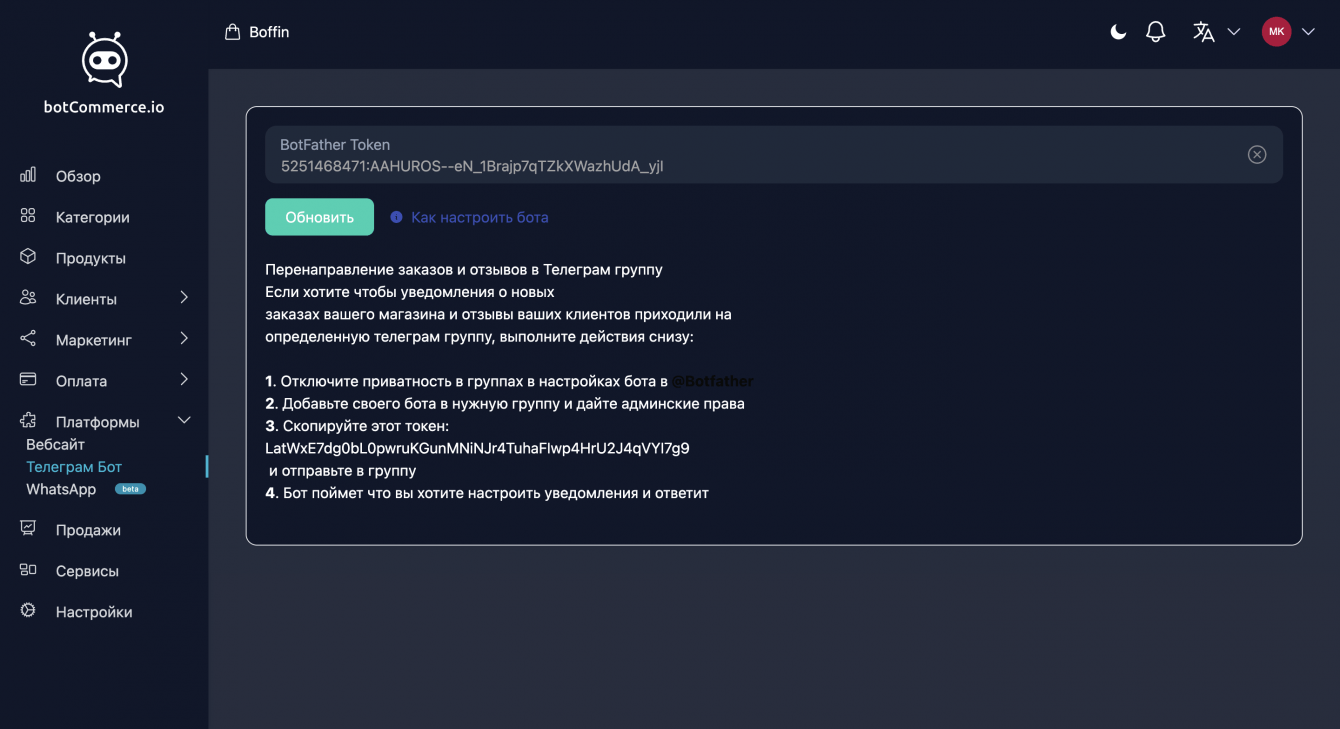 Платформа для создания интернет-магазина через телеграм-бота, которая включает собственную панель управления и CRM-систему.