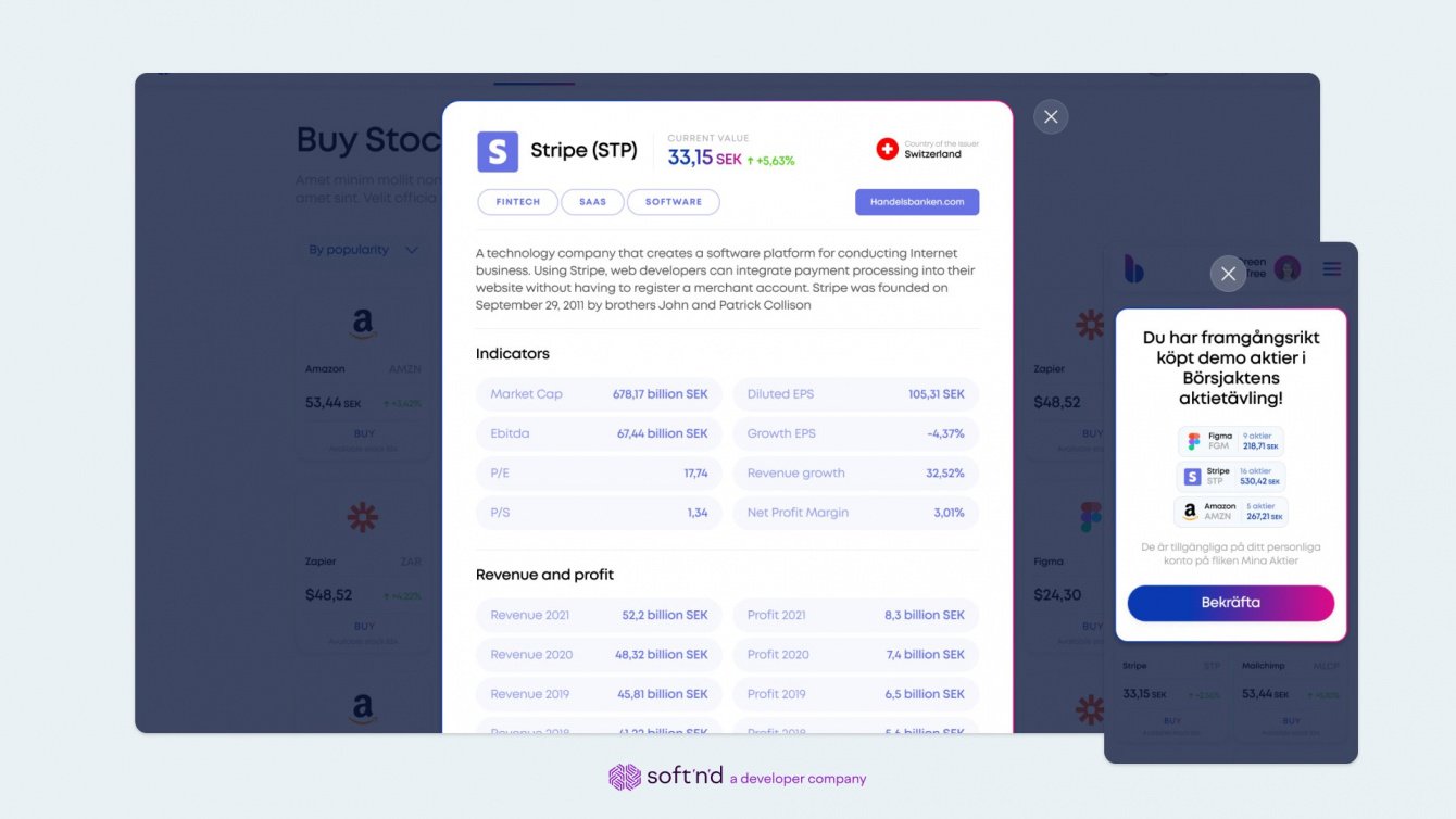 Пожеланием клиента было создание простого и удобного сервиса где пользователи за предоставленную бесплатно демо-валюту могли осуществлять покупку акций разных компаний и наблюдать за изменением своего виртуального счета. Платформа носит некоммерческий характер и доступна любому зарегистрированному пользователю.