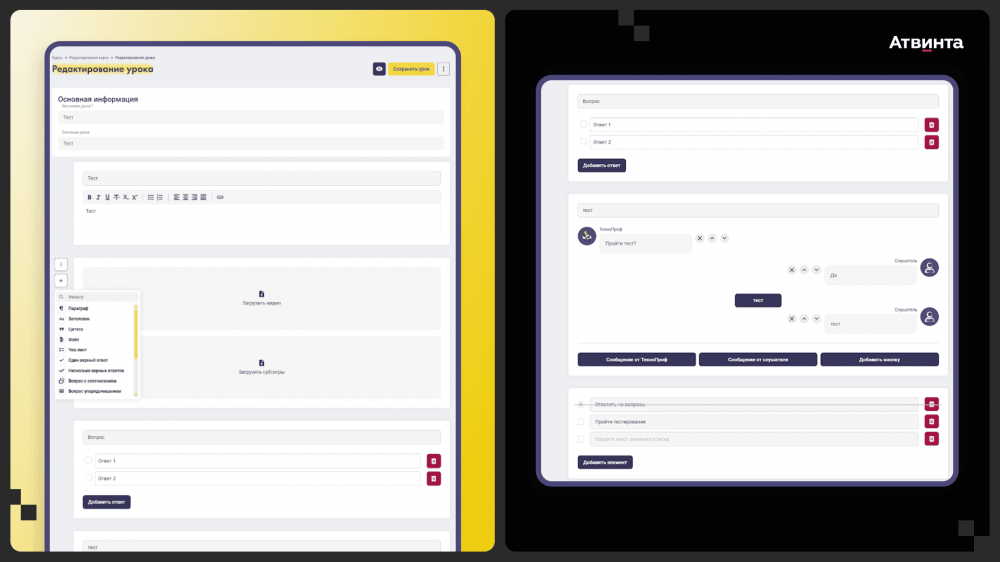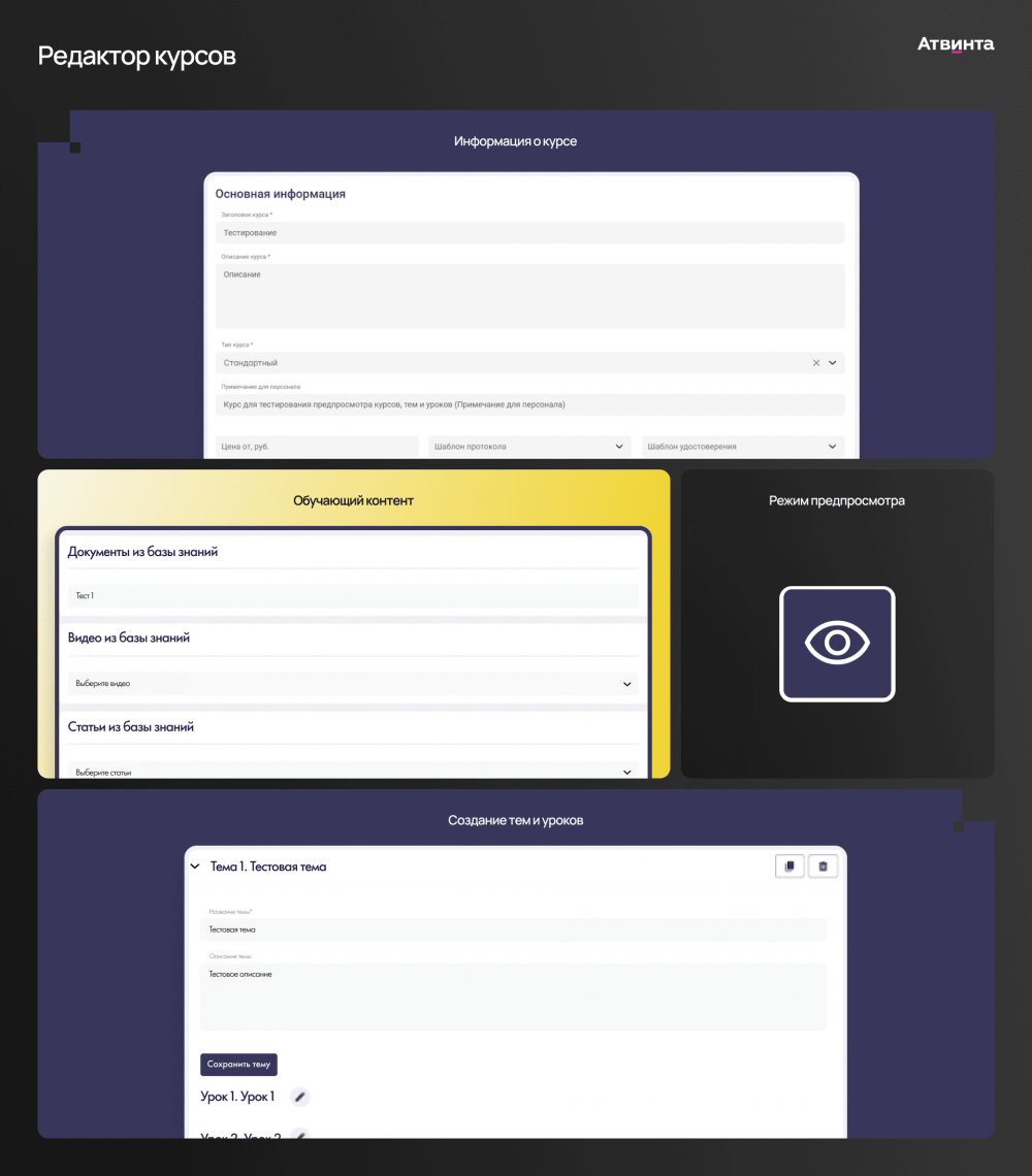 Один из ключевых элементов платформы — это редактор курсов, который позволяет администраторам и методистам создавать образовательные программы под любые задачи.