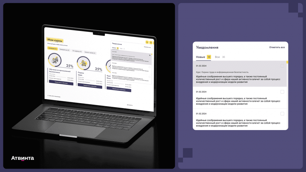 Все результаты фиксируются в системе, а контрагенты и администраторы могут отслеживать прогресс сотрудников в режиме реального времени.