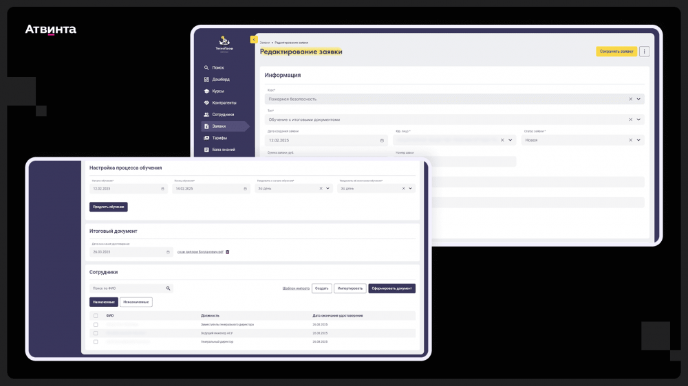 2. Автоматизацию процессов — от создания курсов и генерации заявок до выдачи итоговых документов;