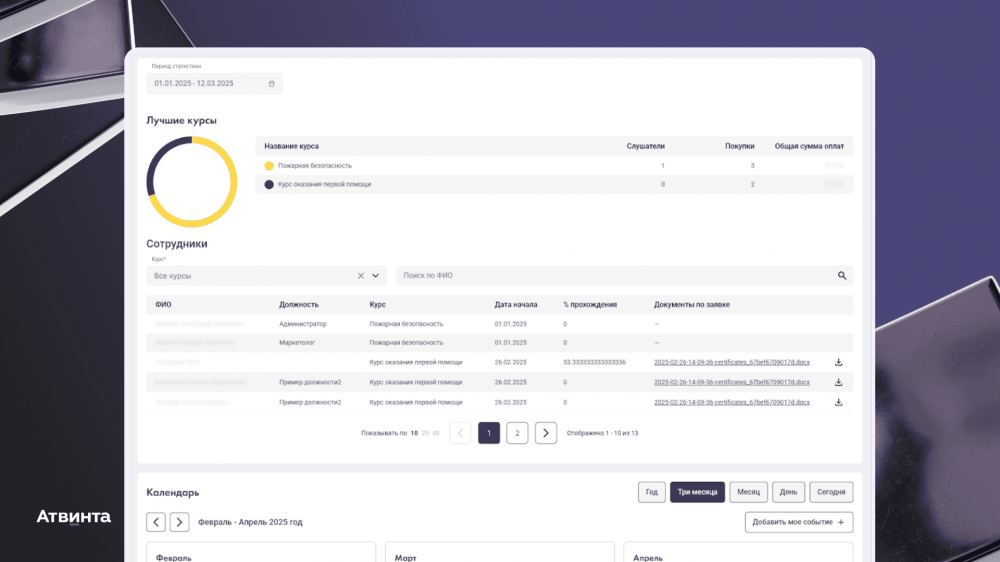 Дашборды помогают отслеживать эффективность обучения и контролировать прохождение курсов сотрудниками.