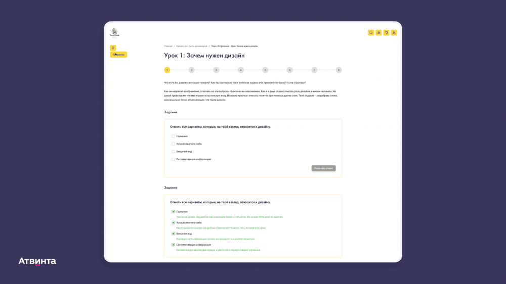 Сделали процесс обучения максимально понятным и вовлекающим, внедрив интерактивные элементы и систему тестирования. Слушатели взаимодействуют с контентом, выполняют задания и проверяют знания в удобном формате.