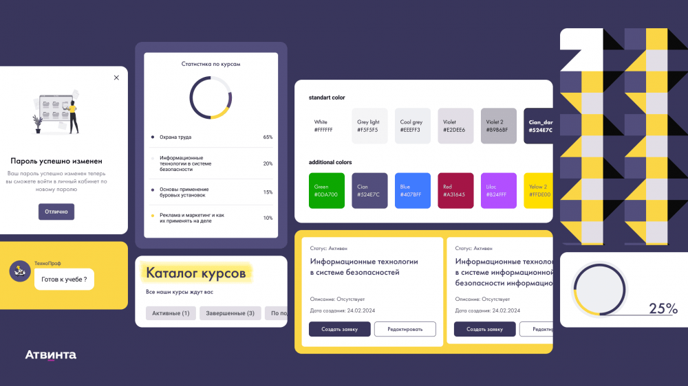 На основе проведенной аналитики переработали часть макетов заказчика, чтобы сделать платформу более удобной. К примеру, дополнили дашборды ключевыми показателями и оптимизировали подачу данных, разделили функциональные блоки «Заявки» и «Курсы», улучшили процесс прохождения обучения для сотрудников.
