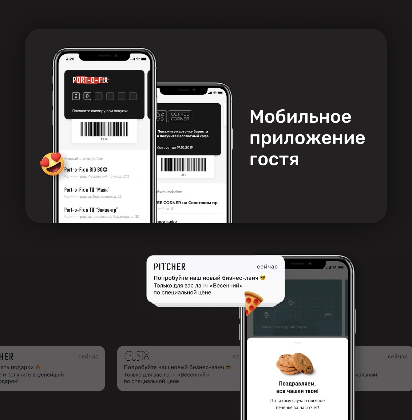 - мобильное приложение гостя с картой лояльности и штрих-кодом;
