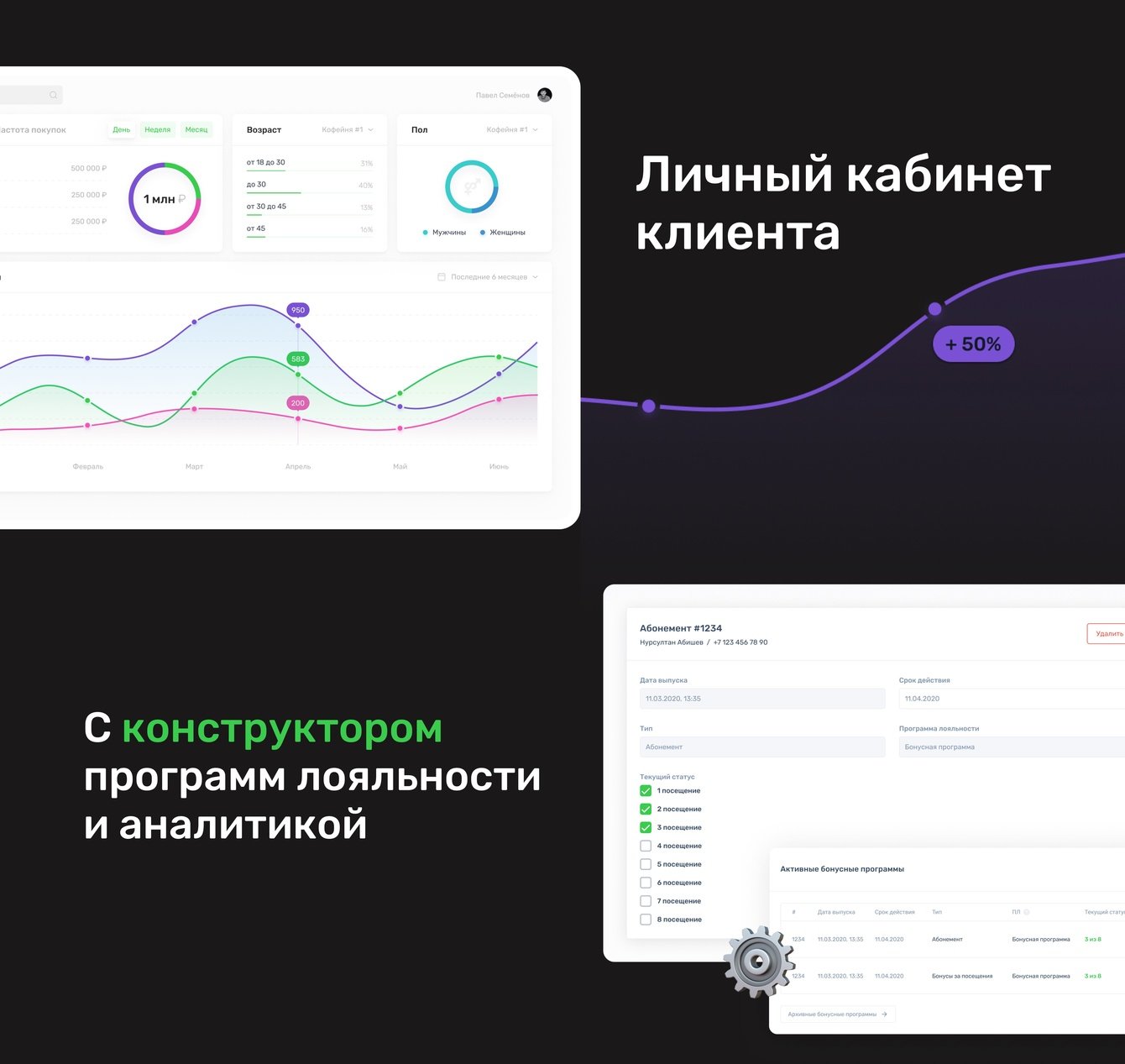 - личный кабинет маркетолога с конструктором программ лояльности и аналитикой.
