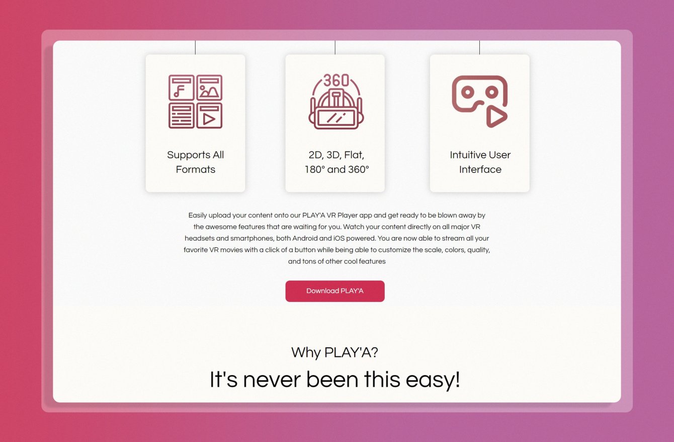 Нам предстояло разработать плеер виртуальной реальности, разместить приложение в популярных магазинах и создать для него сайт. Так появился Play'a — удобный и универсальный видеоплеер виртуальной реальности с простым интерфейсом и адаптивной системой под разные VR платформы.
