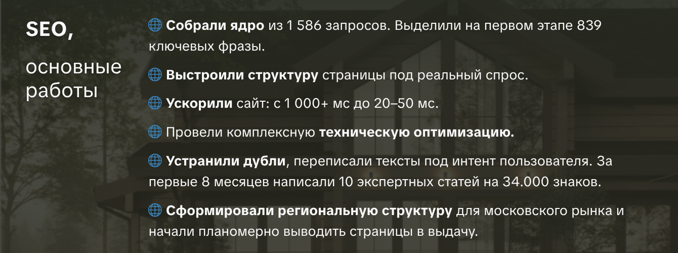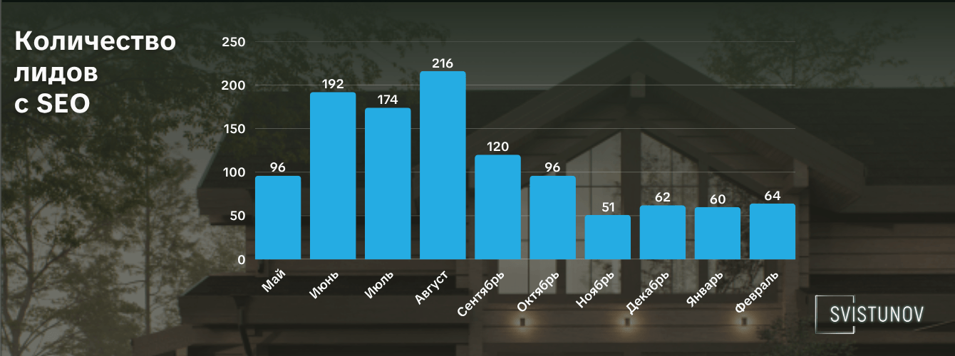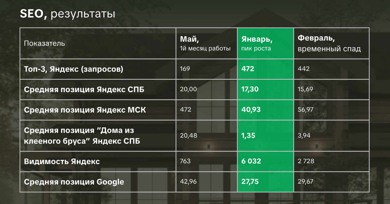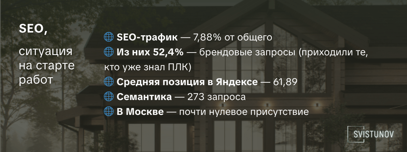 Сайт просто не выдавал то, что ищут пользователи. 273 фразы для ниши с таким объёмом — маленькая семантики. Пользователь вбивает «дом из клееного бруса под ключ в Ленинградской области», и не находит сайт