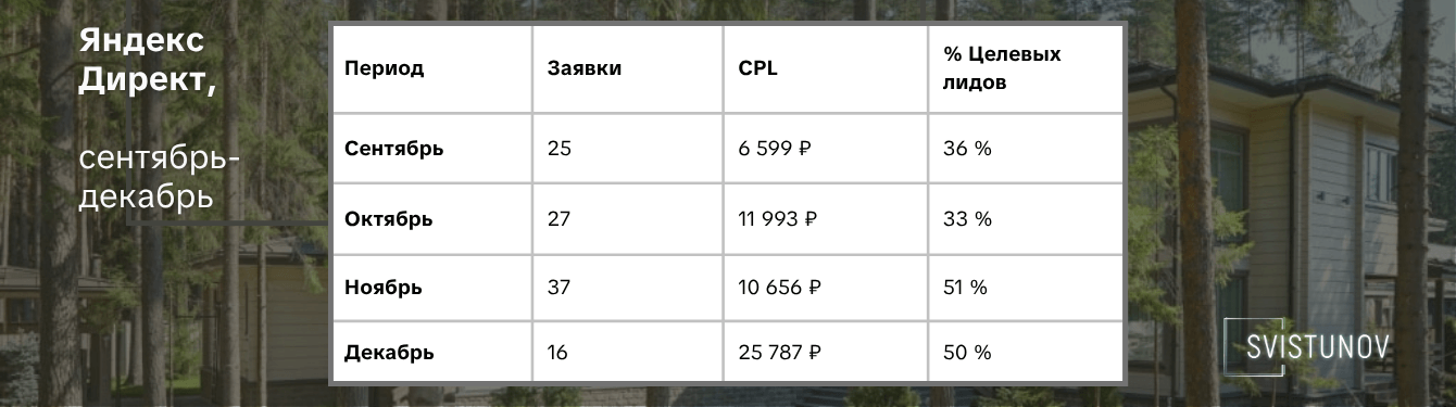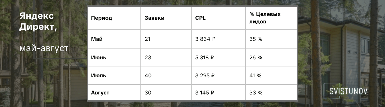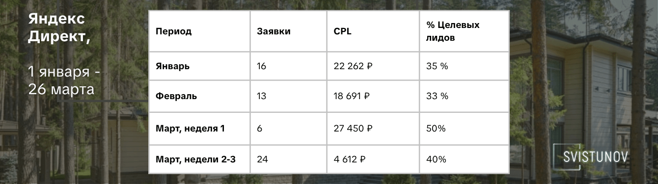 Яндекс Директ сразу дал результат в лидах. Сыграл на руку горячий сезон в строительстве. Хорошая экономика, управляемый рост. Начали масштабировать.