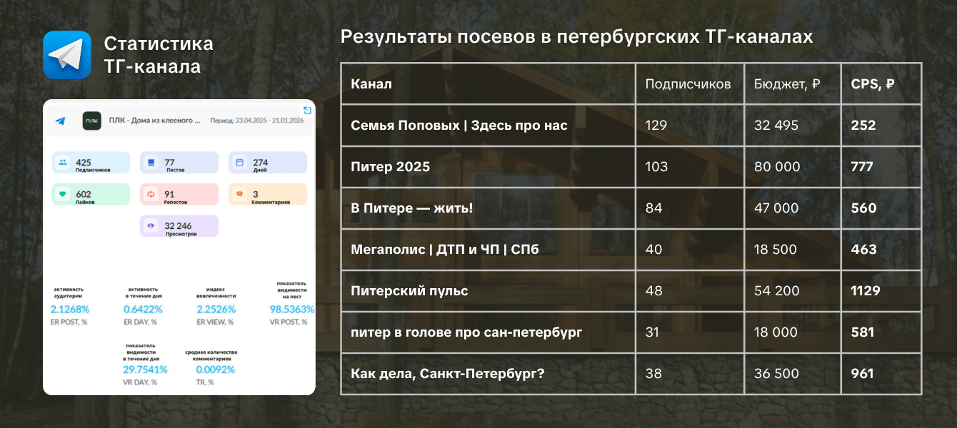 Канал запустили с нуля в апреле 2025. Параллельно вели посевы в городских каналах Санкт-Петербурга. Выбрали это направление осознанно, когда выяснилось, что нишевые блогеры по недвижимости перегреты, цены на размещение очень высокие (CPM до 6 000 ₽ и выше, экономика не сходится).