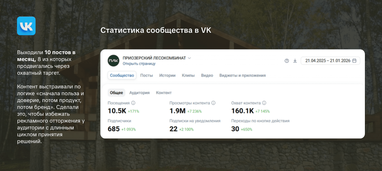В загородном строительстве люди сначала смотрят, сравнивают, привыкают к бренду, и только потом пишут. Поэтому, на старте мы ориентировались не на получение моментальных заявок, а на узнаваемость аудитории.