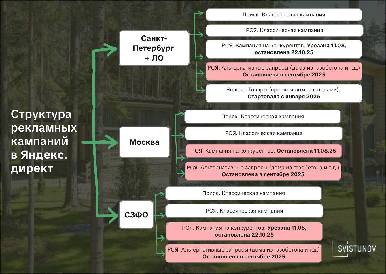 Кампании по альтернативным запросам были остановлены, так как лиды с них не конвертировались. Поступали заявки от людей, которые были изначально ориентированы на другой продукт, они не шли дальше по воронке. Люди оказались не готовы к премиум сегменту и не были ценителями клееного бруса.