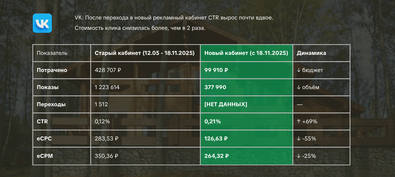В январе 2026го подргузили в профиль проекты коттеджей с ценами, и стали рекламировать их как товары. В январе заявок не было, а вот в феврале пришел 1 качественно-целевой лид. Приняли решение развивать эту кампанию дальше.