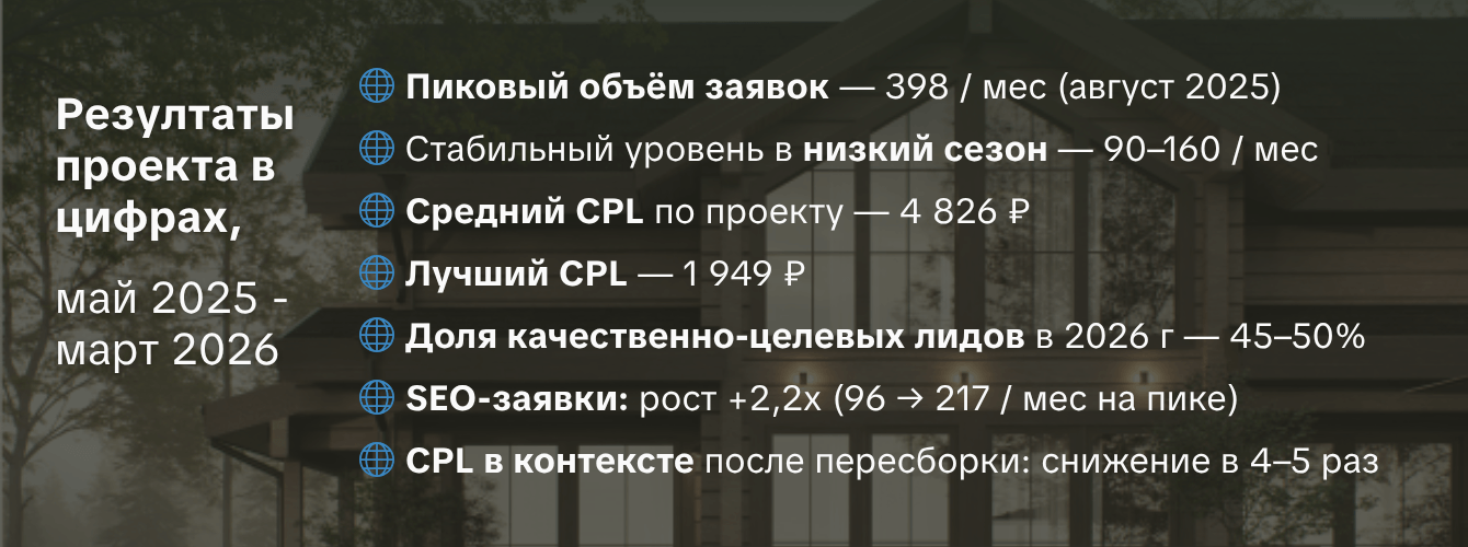 ▶️ Важно: этот средний показатель сильно тянет вверх период перегрева. После пересборки цифры снизились, даже в несезон. С 9 марта 2026 CPL не превышает 5.000 ₽.