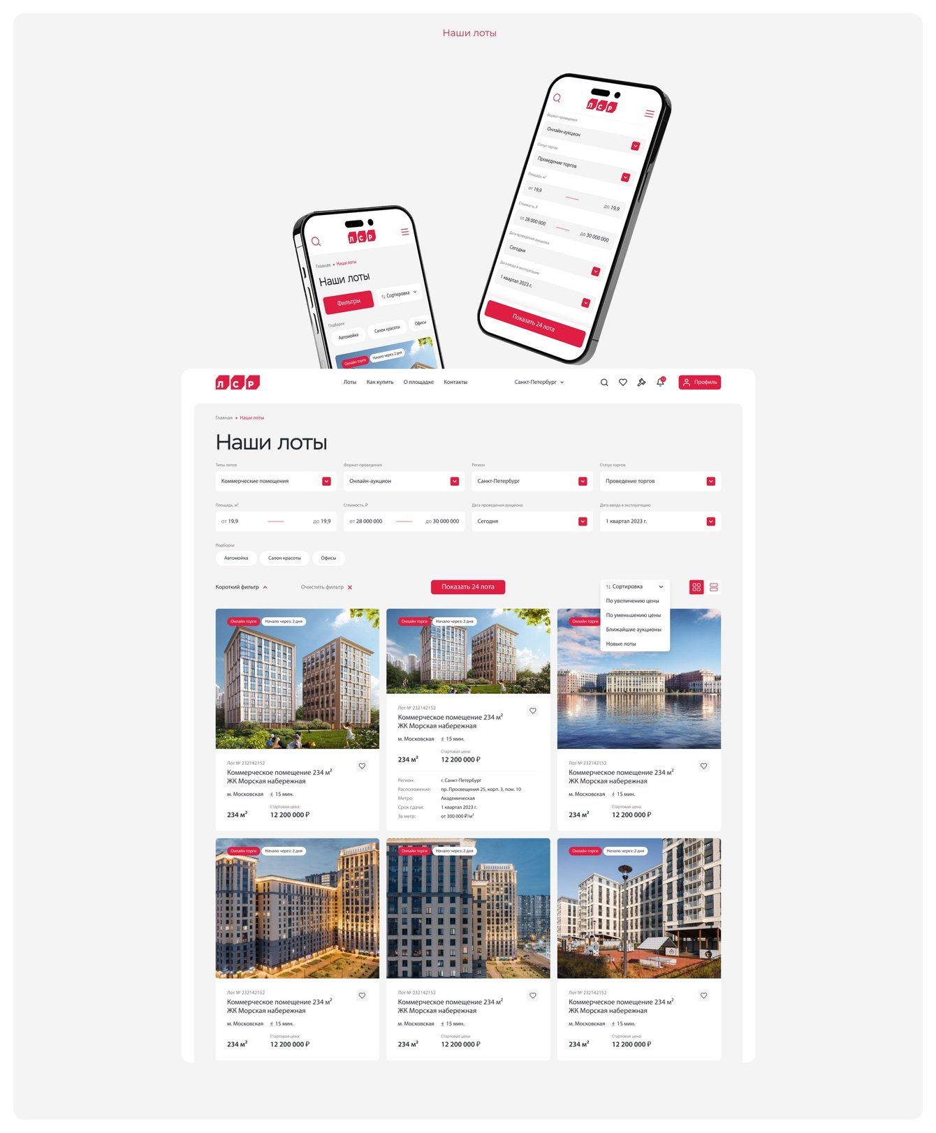 В каталоге лотов доступна фильтрация по параметрам, листинг двух типов (плитка и список) и бесконечный скролл. Ховеры на карточках лотов открывают больше краткой информации об объекте.
