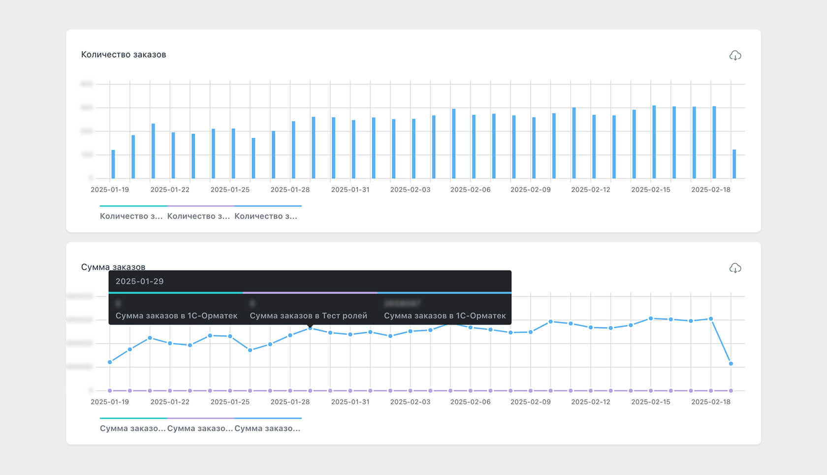 Раньше по каждому бренду отчёты создавались в 1С и выгружались в Excel — да, наглядно, но когда у тебя пачка маркетплейсов и четыре бренда — это долго и муторно. На площадке мы предусмотрели возможность строить графики в одном месте — так все заказы по всем брендам и по всем маркетплейсам как на ладони.