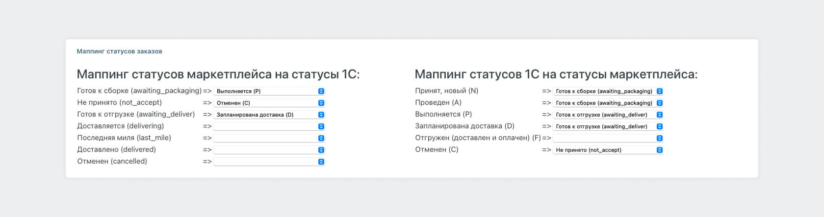 Было важно сопоставить статусы заказов: в 1С они свои, у каждого маркетплейса — тоже свои. Поэтому мы реализовали гибкую настройку соответствий (так называемый «маппинг»), которая может меняться админом площадки. Например, на маркетплейсе у заказа есть статус «Готов к сборке» — если отдать его в 1С, как есть, она ничего не поймёт. С помощью маппинга мы заменяем этот статус на понятный ей «Выполняется». И наоборот: статус 1С-ки вроде «Запланирована доставка» для маркетплейса — китайская грамота, а вот «Готов к отгрузке» — уже другое дело.