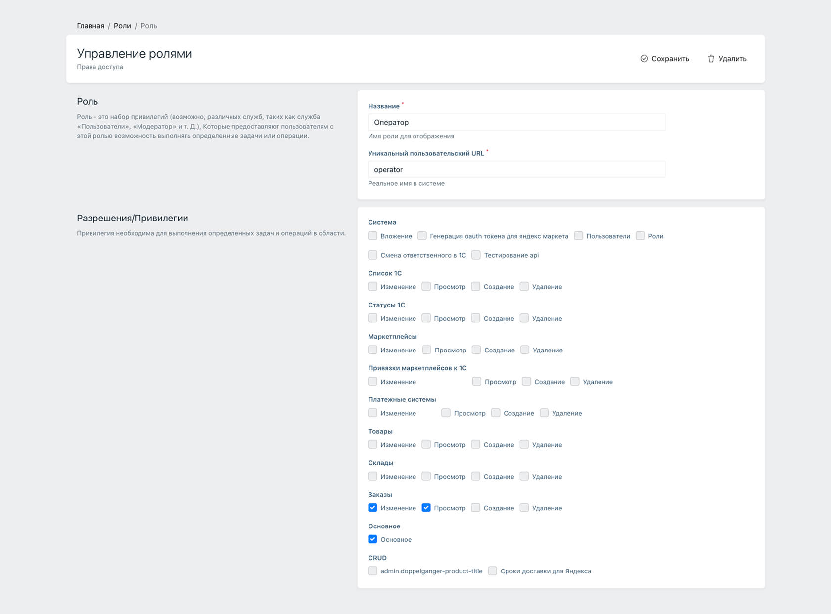 С заказами на площадке работают разные специалисты: это и менеджеры маркетплейсов, и админы самой площадки. Поэтому мы реализовали для разных пользователей площадки свои роли. Админ — во главе угла: он добавляет менеджеров и операторов и настраивает для них уровни доступов. Настройки — максимально гибкие: можно выбрать, что и в какой категории будет доступно пользователю: от изменений списка всех 1С в системе до удаления заказов.