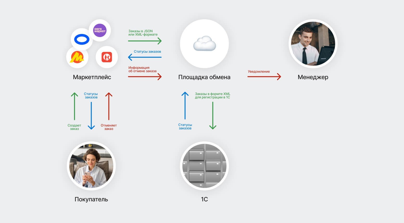 • Из 1С статусы заказа (сформирован, готовится к отправке, отправлен и так далее) передаются на площадку обмена, которая в свою очередь передает их в маркетплейс (вплоть до финального статуса).