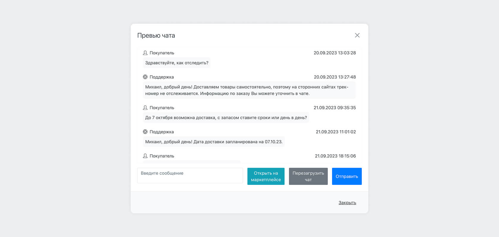 5. Чат в маркетплейсе. При работе по схеме FBS, когда продавец сам отвечает за хранение и доставку товара, он часто общается с покупателями по деталям заказа в чате на самом маркетплейсе. Чтобы менеджеры «Орматека» не заходили на каждый маркетплейс для переписки с покупателями, мы вывели чат маркетплейса на отдельную вкладку детальной страницы заказа. Передача данных — отдельно по API. Такое решение серьезно упрощает и ускоряет работу.