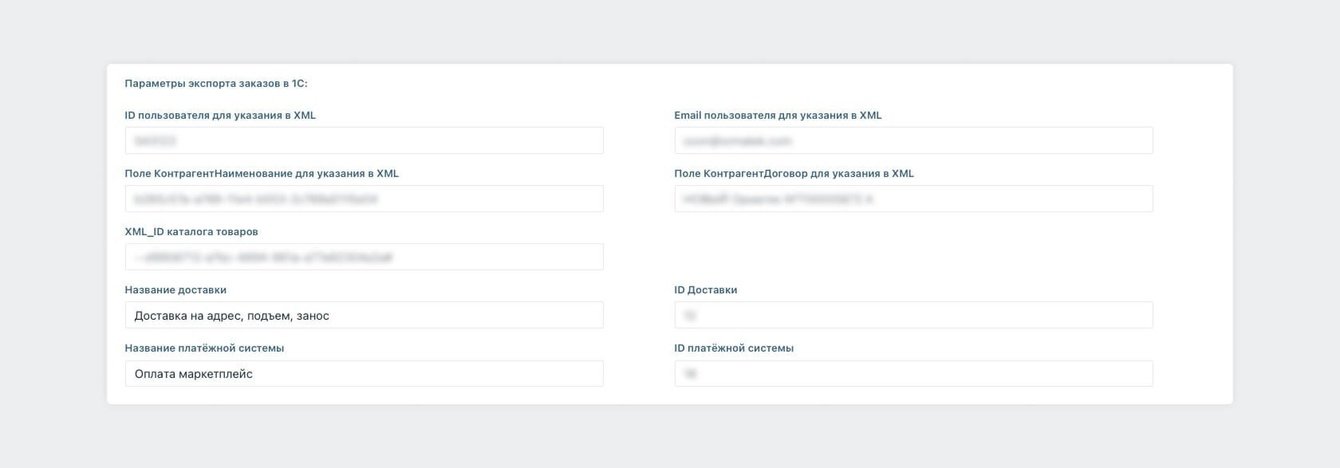 • Данные текущего сайта – ID доставок, ID оплат, ID товаров, которые 1С уже знала как ID от маркетплейсов (без необходимости вносить изменения в 1С).