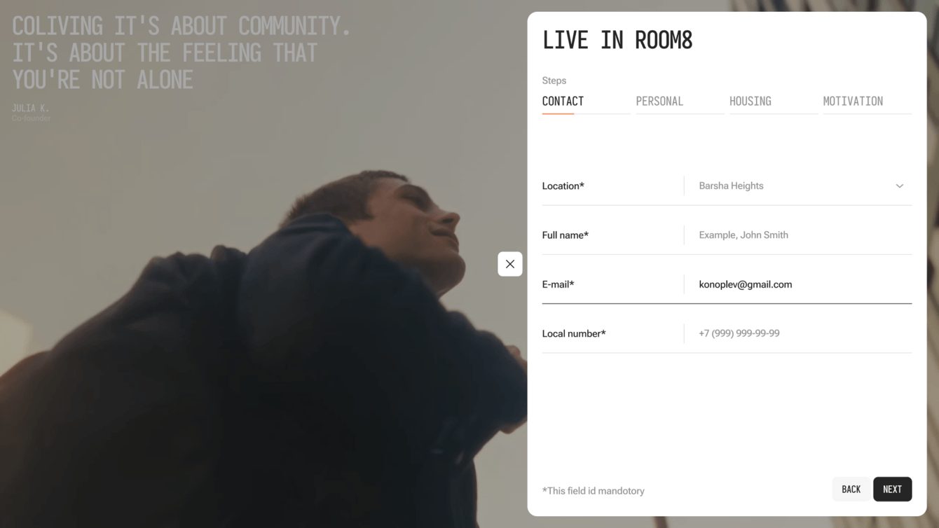 Проработали структуру сайта, чтобы каждый раздел отвечал на конкретные вопросы потенциального жильца: что такое R8, чем он отличается от других вариантов жилья, какие есть пространства, как проходят мероприятия, как устроены рабочие зоны и бытовые процессы, какие люди здесь живут и чем занимаются.
