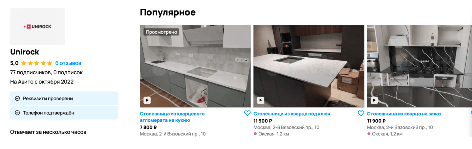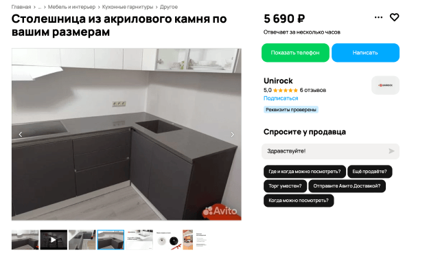 - Выделили ключевые преимущества и на их основе создали, оформили и seo-оптимизировали 210 уникальных объявлений для двух видов товаров: столешницы и подоконники.