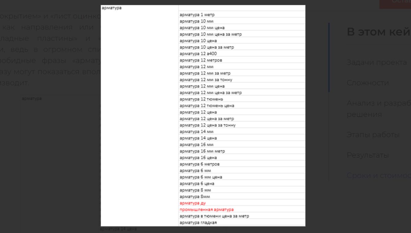 В процессе сбора семантики запросили консультацию специалиста, который мог подсказать нам, что, к примеру, «штрипс с полимерным покрытием» и «лист оцинкованный с полимерным покрытием в рулонах» лучше не разделять как направления или что к направлению «плазменная резка» вполне подходят «закладные пластины» и «косынки металлические». Тщательно проверяли продуктовую линейку клиента: в огромном списке запросов по направлению «арматура» встречались фразы вроде «арматура ду» или «арматура промышленная», которые неопытному глазу могут показаться вполне подходящими, но на деле в ассортименте отсутствуют.