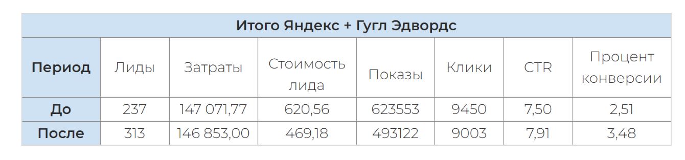В план работ по переработке рекламы вошли сбор новой семантики, оптимизация рекламных кампаний и подключение медийно-контекстной рекламы.