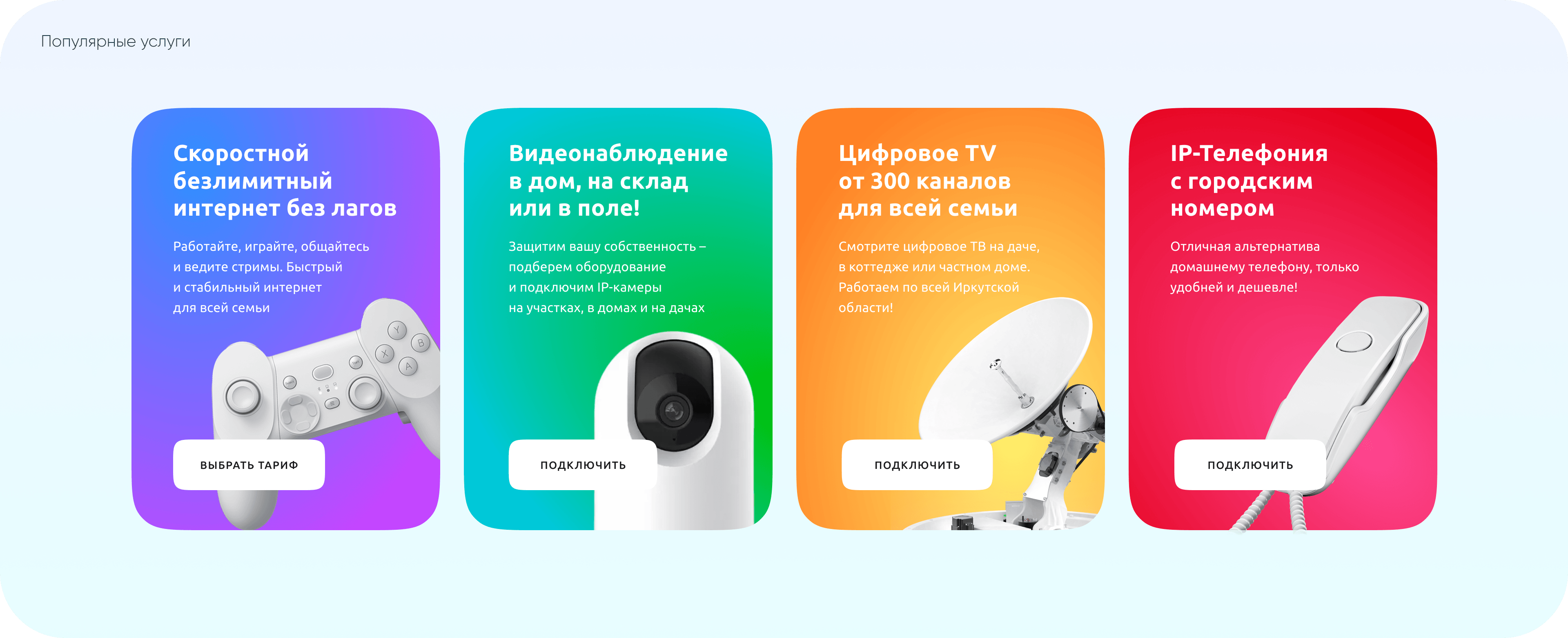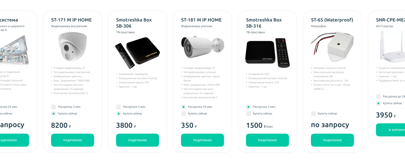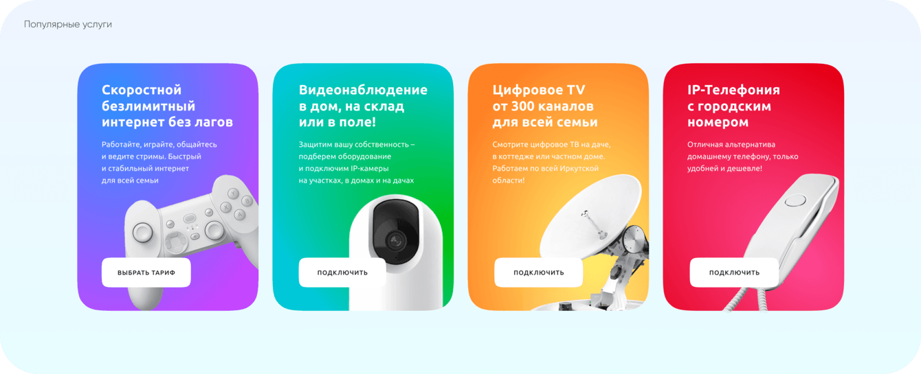 Разделы услуг "Видеонаблюдение", "Телевидение", "Домашний интернет" реализованы отдельными лендингами для более точной индексации в поисковых системах, чтобы продвигаться на разную целевую аудиторию. Структура страниц детально проработана под каждую услугу таким образом, чтобы пользователь быстро разобрался и закрыл все свои вопросы и возражения, в том числе ознакомился с тарифами прямо на сайте.