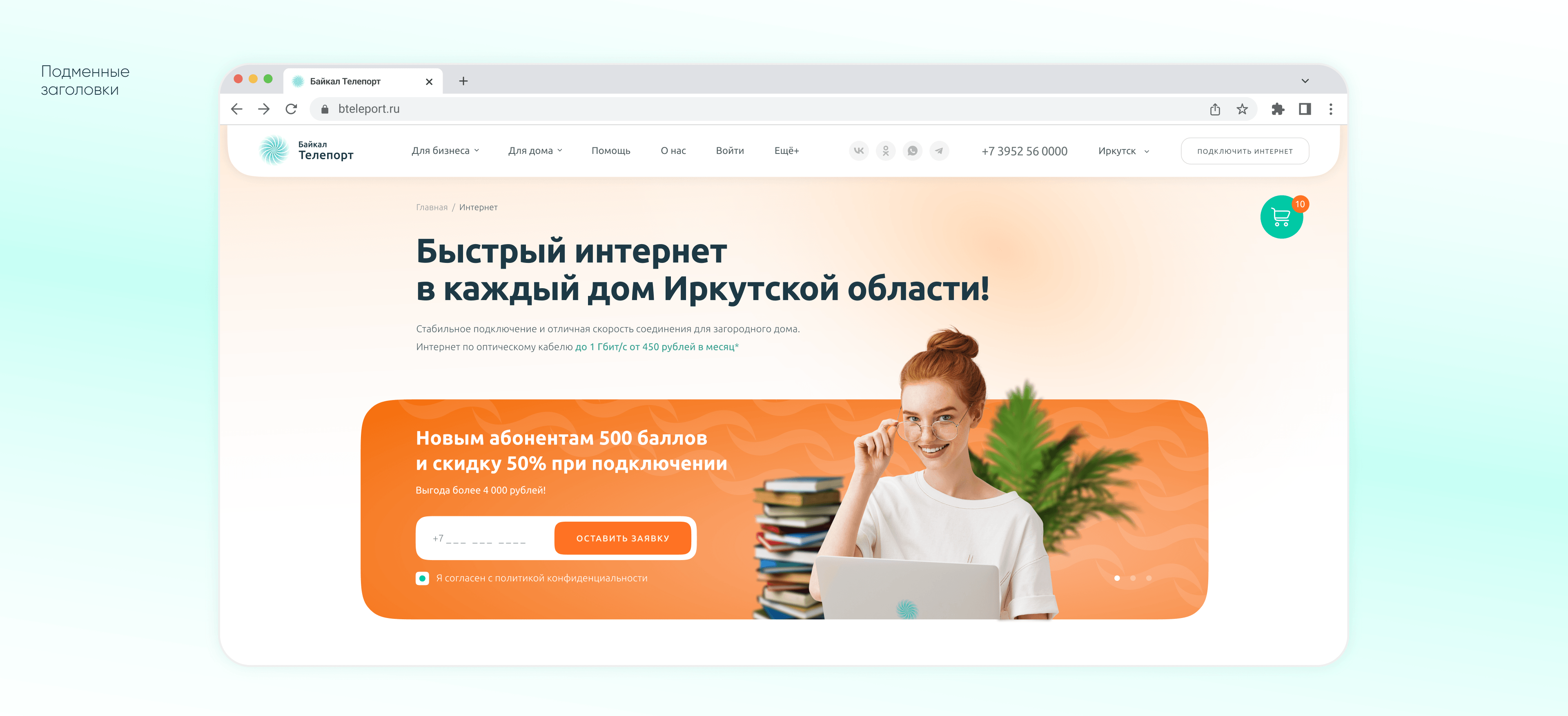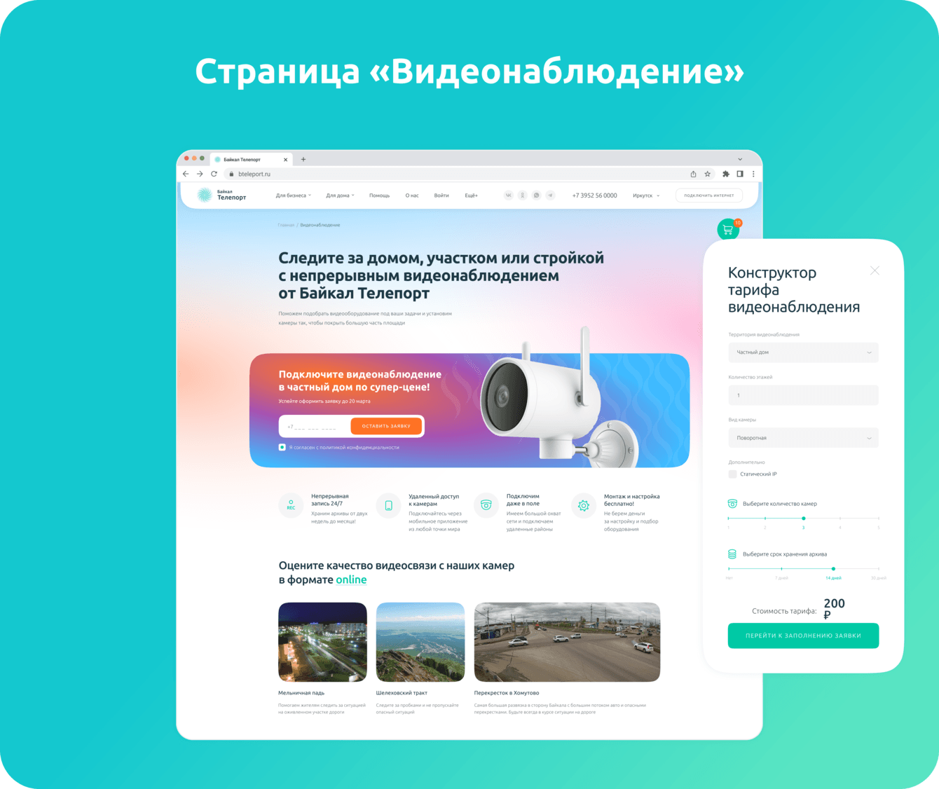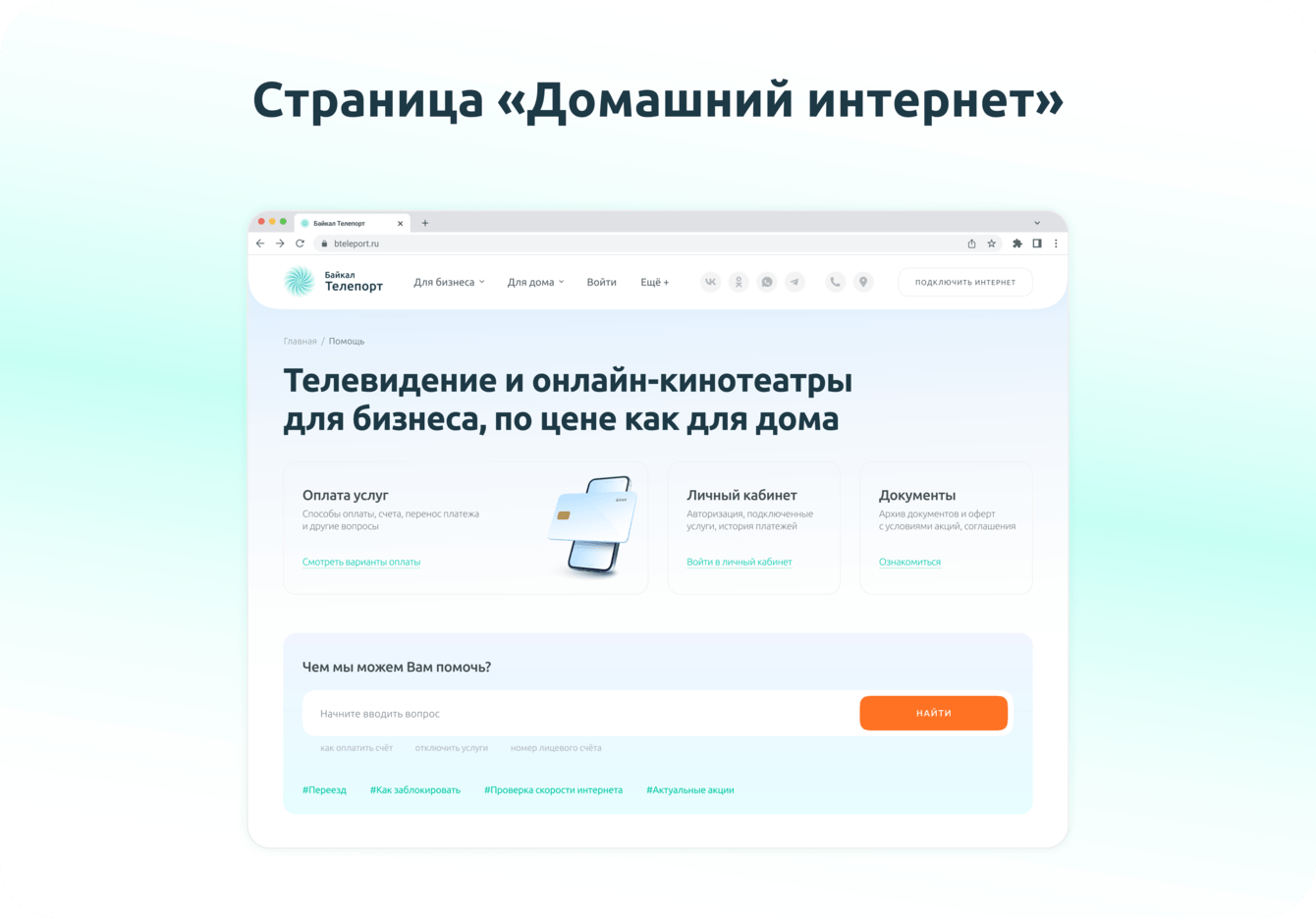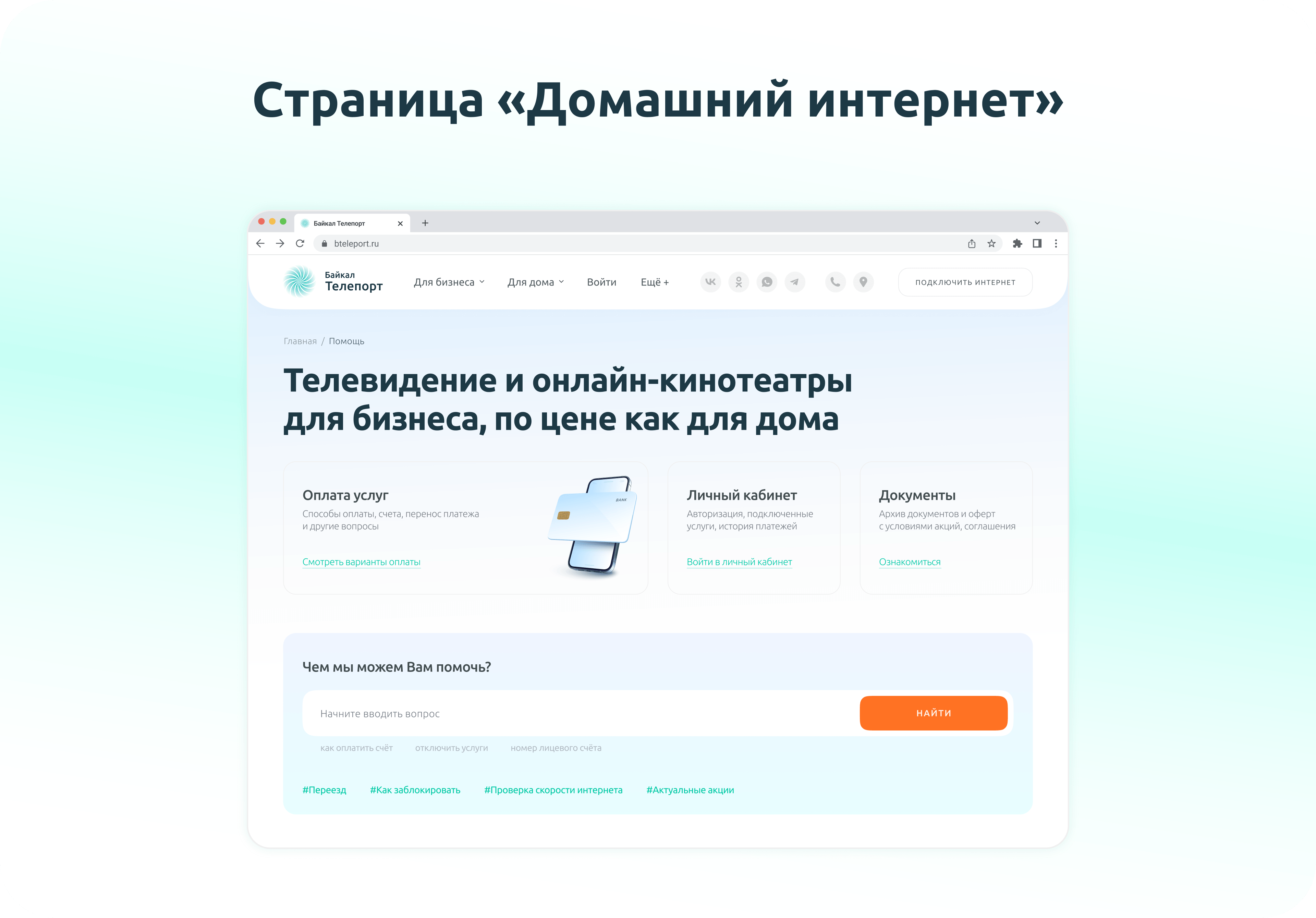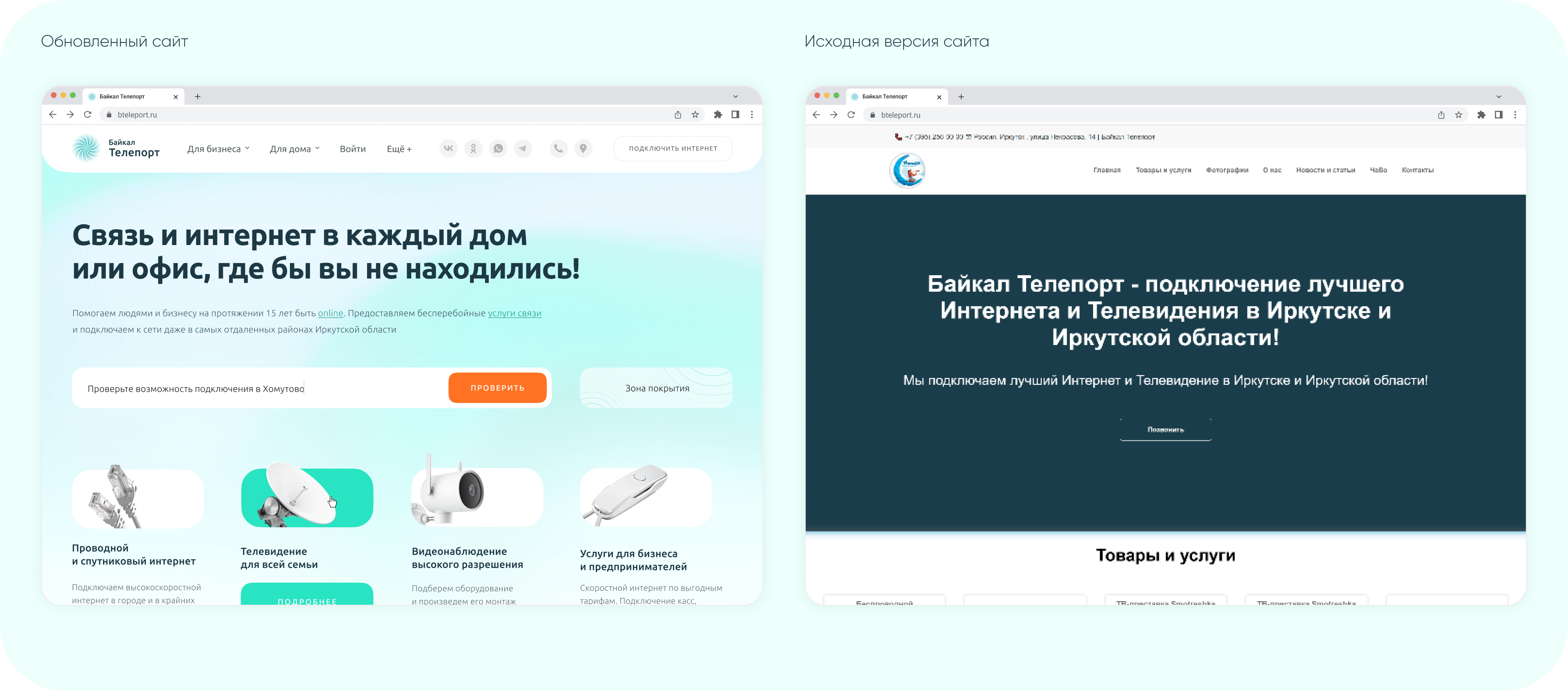 Байкал Телепорт — интернет-провайдер, предоставляющий услуги подключения интернета, телевидения и видеонаблюдения для дома и бизнеса в Иркутске и Иркутской области. На момент старта проекта у компании отсутствовал современный сайт, способный эффективно конвертировать посетителей в клиентов и выделяться на фоне конкурентов.